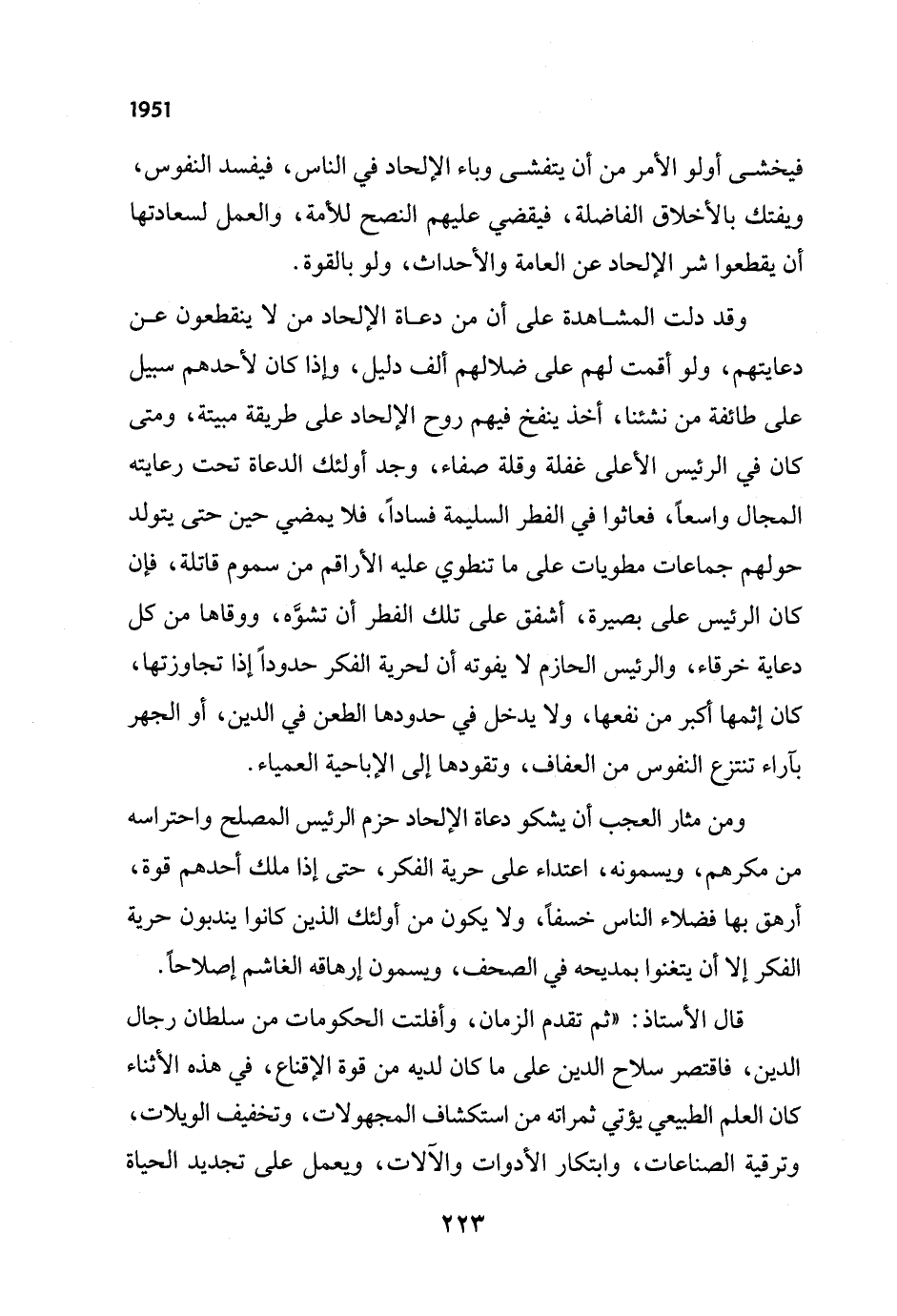 ومن مثار العجب أن يشكو دعاة الإلحاد حزم الرئيس المصلح واحتراسه من مكرهم، ويسمونه، اعتداء على حرية الفكر، حتى إذا ملك أحدهم قوة، أرهق بها فضلاء الناس خسفاً، ولا يكون من أولئك الذين كانوا يندبون حرية الفكر إلا أن يتغنوا بمديحه في الصحف، ويسمون إرهاقه الغاشم إصلاحاً.