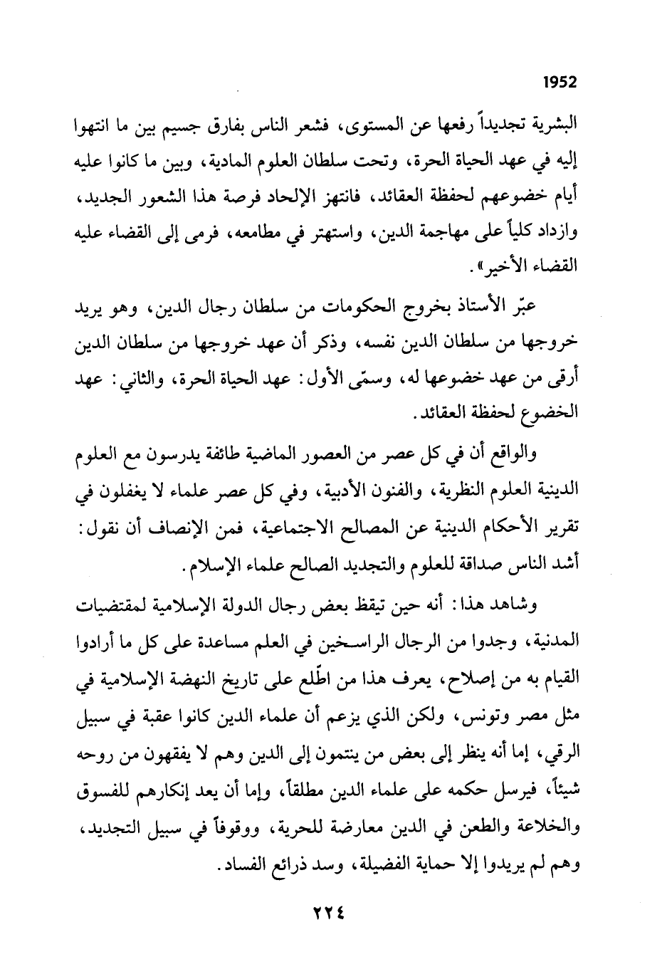 وشاهد هذا: أنه حين تيقظ بعض رجال الدولة الإسلامية لمقتضيات المدنية، وجدوا من الرجال الراسخين في العلم مساعدة على كل ما أرادوا القيام به من إصلاح، يعرف هذا من اطلع على تاريخ النهضة الإسلامية في مثل مصر وتونس، ولكن الذي يزعم أن علماء الدين كانوا عقبة في سبيل الرقي، إما أنه ينظر إلى بعض من ينتمون إلى الدين وهم لا يفقهون من روحه شيئاً، فيرسل حكمه على علماء الدين مطلقاً، وإما أن يعد إنكارهم للفسوق والخلاعة والطعن في الدين معارضة للحرية، ووقوفاً في سبيل التجديد، وهم لم يريدوا إلا حماية الفضيلة، وسد ذرائع الفساد.