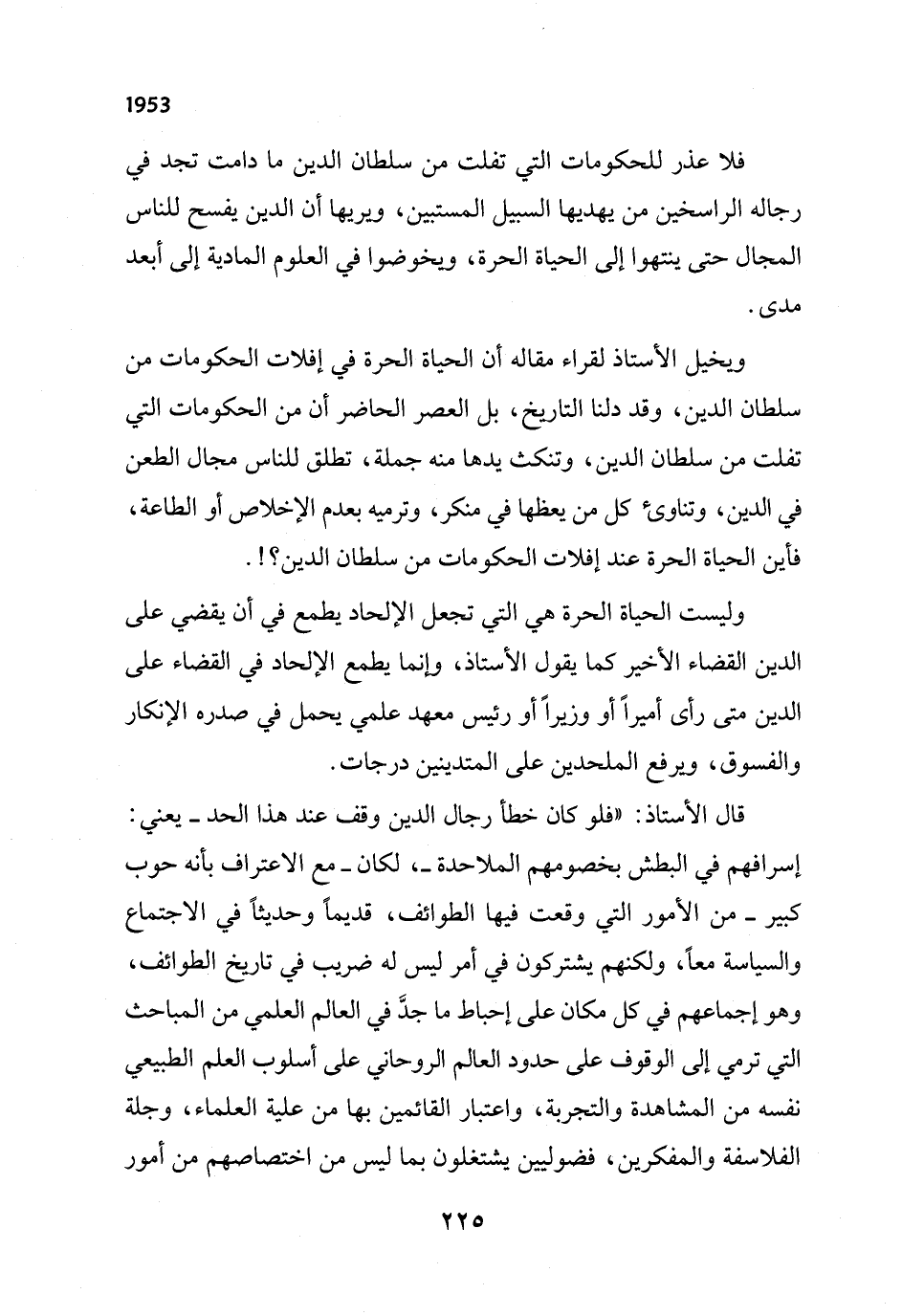 فلا عذر للحكومات التي تفلت من سلطان الدين ما دامت تجد في رجاله الراسخين من يهديها السبيل المستبين، ويريها أن الدين يفسح للناس المجال حتى ينتهوا إلى الحياة الحرة، ويخوضوا في العلوم المادية إلى أبعد مدى.