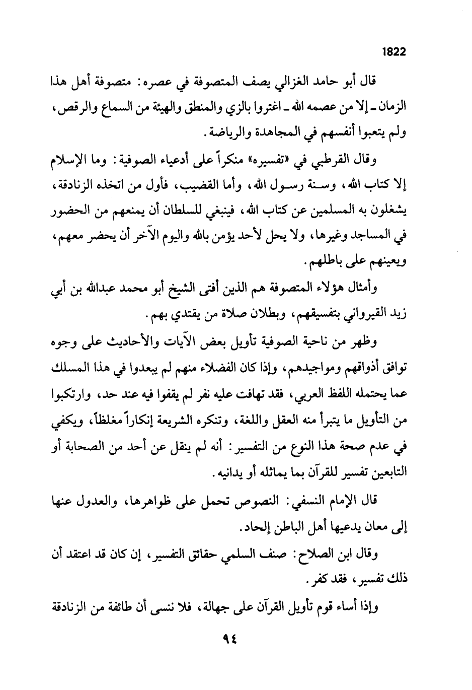 وقال القرطبي في "تفسيره" منكراً على أدعياء الصوفية: وما الإسلام إلا كتاب الله، وسنة رسول الله، وأما القضيب، فأول من اتخذه الزنادقة، يشغلون به المسلمين عن كتاب الله، فينبغي للسلطان أن يمنعهم من الحضور في المساجد وغيرها، ولا يحل لأحد يؤمن بالله واليوم الآخر أن يحضر معهم، ويعينهم على باطلهم.