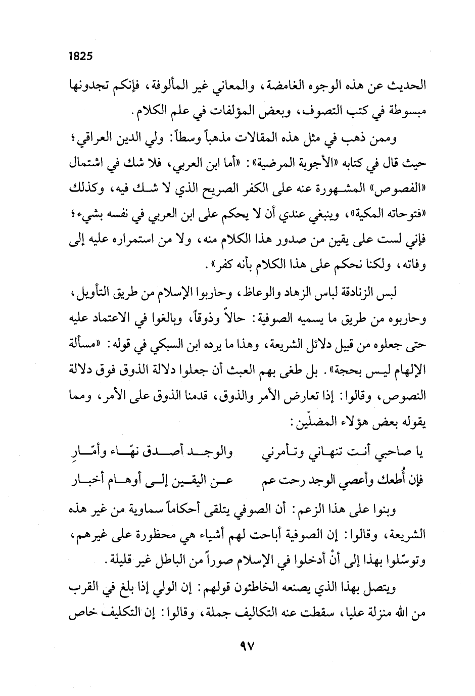 وممن ذهب في مثل هذه المقالات مذهباً وسطاً: ولي الدين العراقي؛ حيث قال في كتابه "الأجوبة المرضية": "أما ابن العربي، فلا شك في اشتمال "الفصوص" المشهورة عنه على الكفر الصريح الذي لا شك فيه، وكذلك "فتوحاته المكية"، وينبغي عندي أن لا يحكم على ابن العربي في نفسه بشيء؛ فإني لست على يقين من صدور هذا الكلام منه، ولا من استمراره عليه إلى وفاته، ولكنا نحكم على هذا الكلام بأنه كفر".