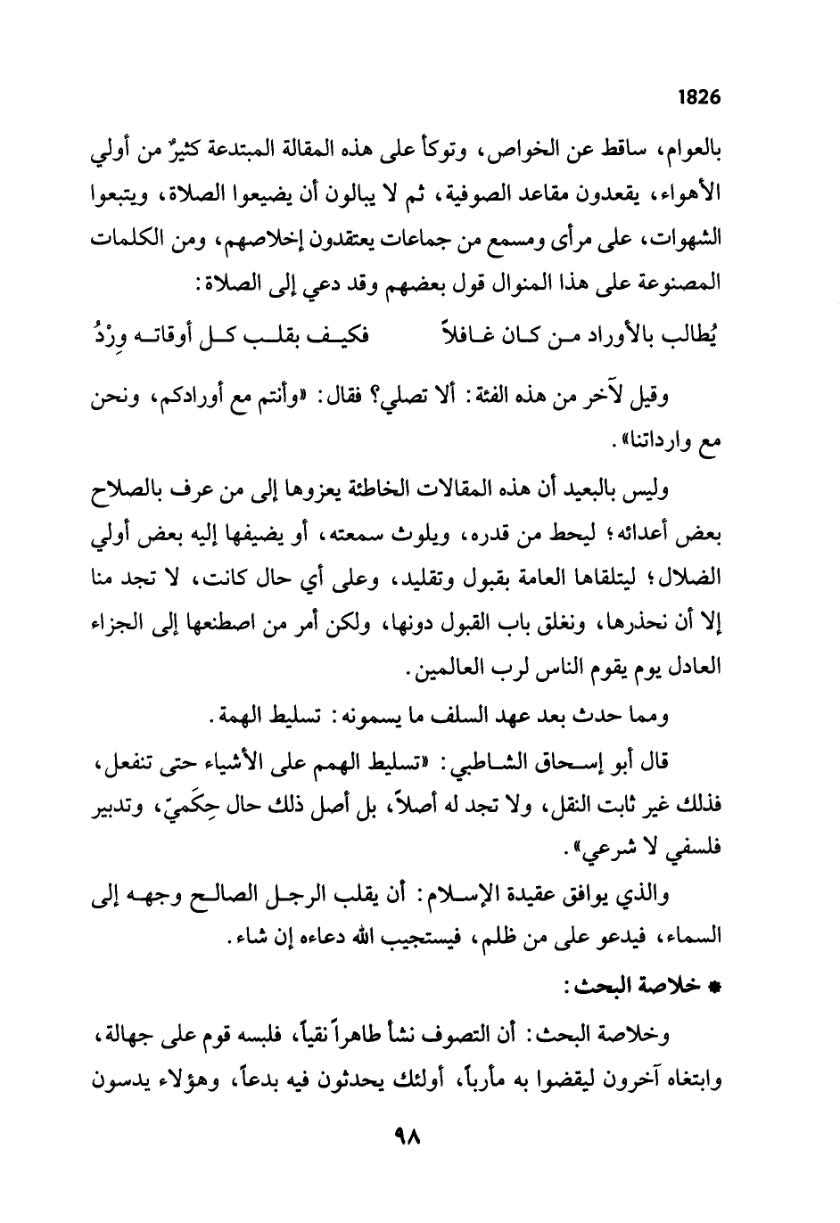وخلاصة البحث: أن التصوف نشأ طاهراً نقياً، فلبسه قوم على جهالة، وابتغاه آخرون ليقضوا به مأرباً، أولئك يحدثون فيه بدعاً، وهؤلاء يدسون