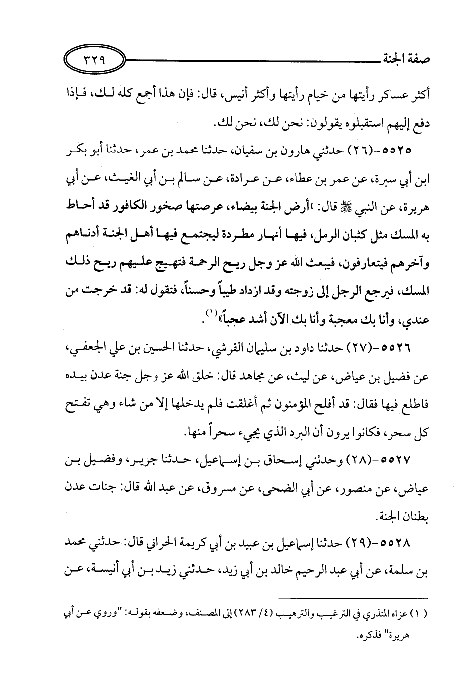 26 - حدثني هارون بن سفيان, حدثنا محمد بن عمر, حدثنا أبو بكر بن أبي سبرة عن عمر بن عطاء عن عرادة عن سالم بن أبي الغيث عن أبي هريرة عن النبي صلى الله عليه وسلم قال أرض الجنة بيضاء عرصتها صخور الكافور وقد أحاط به المسك مثل كثبان الرمل فيها أنهار مطردة فيجتمع فيها أهل الجنة أدناهم وآخرهم فيتعارفون فيبعث الله عز وجل بريح الرحمة فتهيج عليهم ريح ذلك المسك فيرجع الرجل إلى زوجته وقد ازداد طيبا وحسنا فتقول له قد خرجت من عندي وأنا بك معجبة وأن بك الآن أشد عجبا.