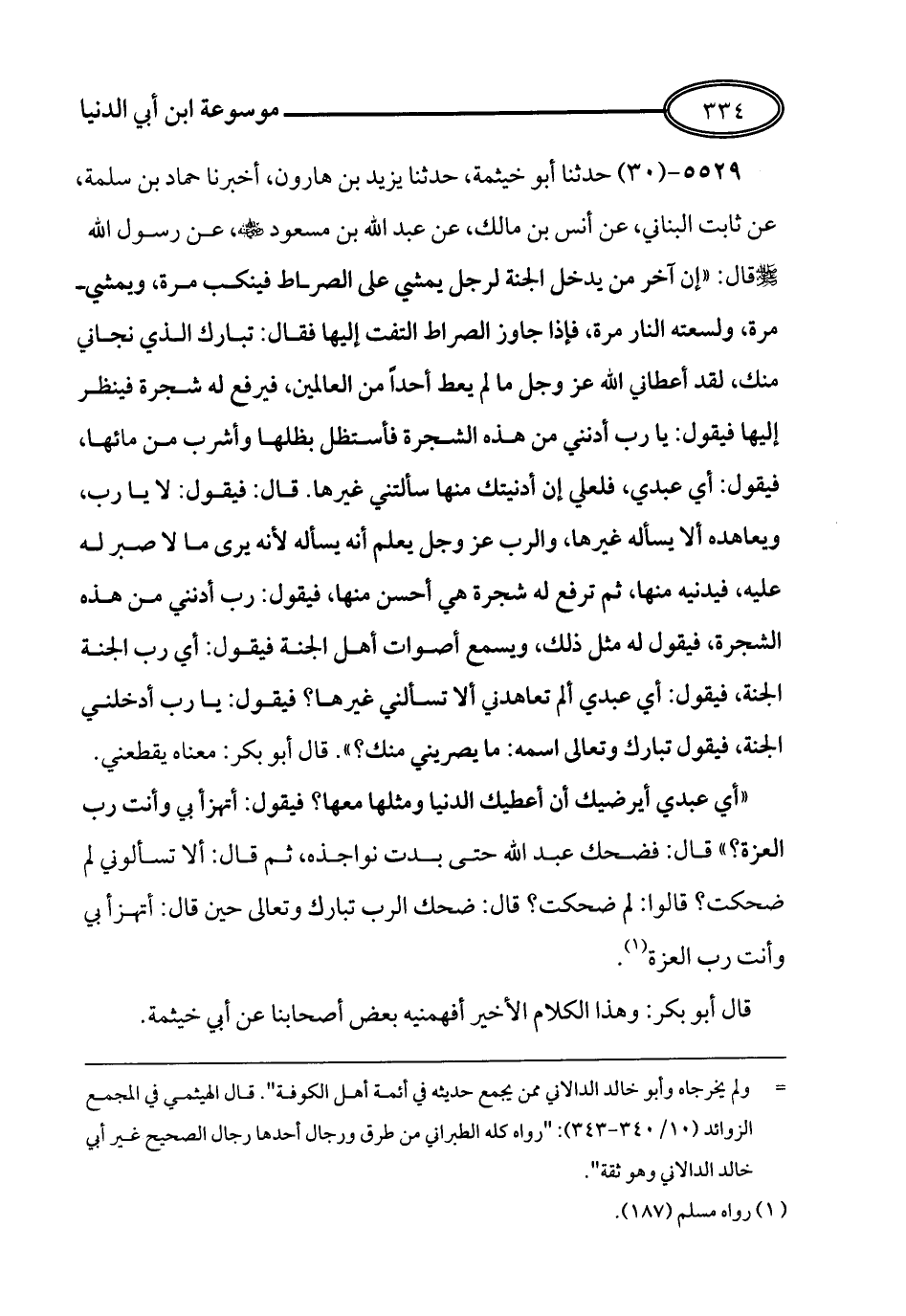 30 - حدثنا أبو خيثمة, حدثنا يزيد بن هارون أخبرنا حماد بن سلمة عن ثابت البناني عن أنس بن مالك عن عبد الله بن مسعود رضي الله عنه عن النبي صلى الله عليه وسلم قال إن آخر من يدخل الجنة لرجل يمشي على الصراط فينكب مرة ويمشي مرة ولسعته النار مرة فإذا جاوز الصراط إلتفت إليها فقال تبارك الله الذي نجاني منك لقد أعطاني الله عز وجل مالم يعط أحدا من العالمين فيرفع له شجرة فينظر إليها فيقول يارب أدنني من هذه الشجرة فأستظل بظلها وأشرب من ماءها فيقول أي عبدي فلعلي إن أدنيتك منها تسألني غيرها قال فيقول لا يا رب ويعاهده أن لا يسأله غيرها والرب عز وجل يعلم أنه يسأله لأنه يرى أن لا صبر له عليه فيدنيه منها ثم ترفع له شجرة هي أحسن منها فيقول ربي أدنني من هذه الشجرة فيقول له مثل ذلك ويسمع أصوات أهل الجنة فقال أي رب الجنة الجنة فيقول أي عبدي ألم تعاهدني أن لا تسألني غيرها فيقول يا رب أدخلني الجنة فيقول تبارك وتعالى اسمه ما يصريني منك قال أبو بكر معنى يقطعني أي عبدي أيرضيك أن أعطيك الدنيا ومثلها فيقول أتهزؤ بي وأنت رب العزة.