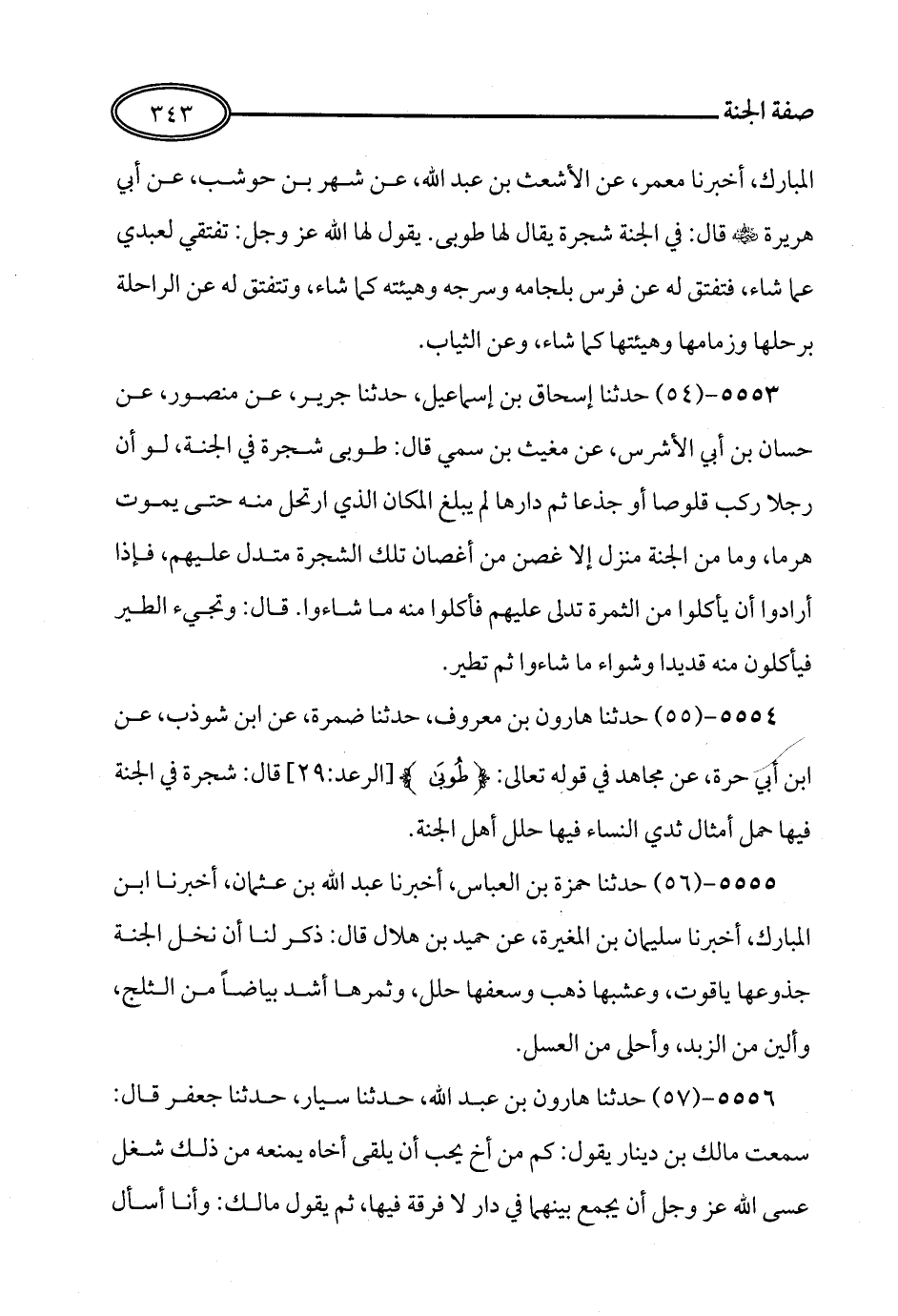 55 - حدثنا هارون بن معروف, حدثنا ضمرة عن ابن شوذب عن ابن أبي وجزة عن مجاهد في قوله تعالى {طوبى} قال شجرة في الجنة فيها حمل أمثال ثدي النساء فيها حلل أهل الجنة.