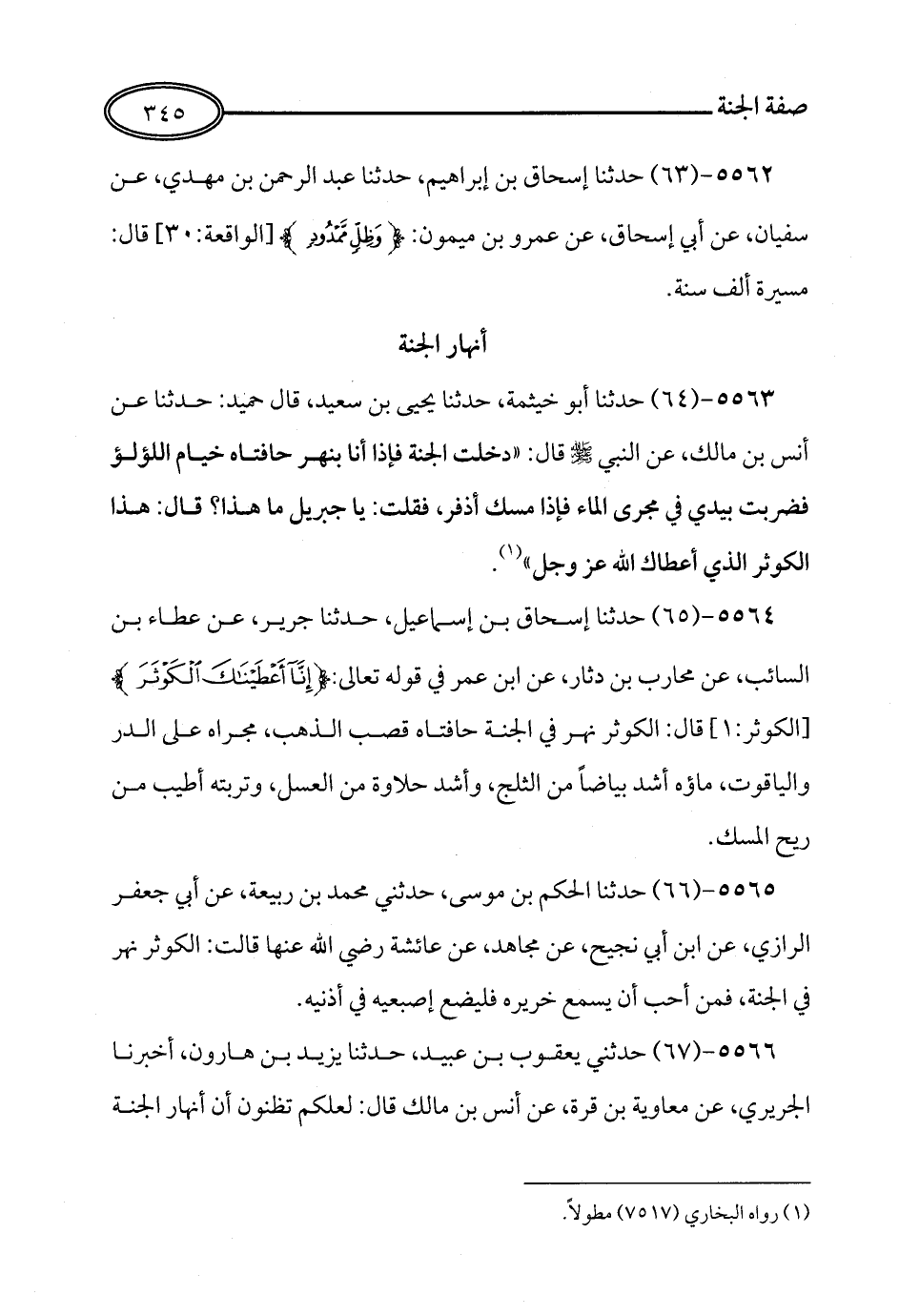 63 - حدثنا إسحاق بن إبراهيم, حدثنا عبد الرحمن بن مهدي عن سفيان عن أبي إسحاق عن عمرو بن ميمون {وظل ممدود} قال مسيرة ألف سنة.