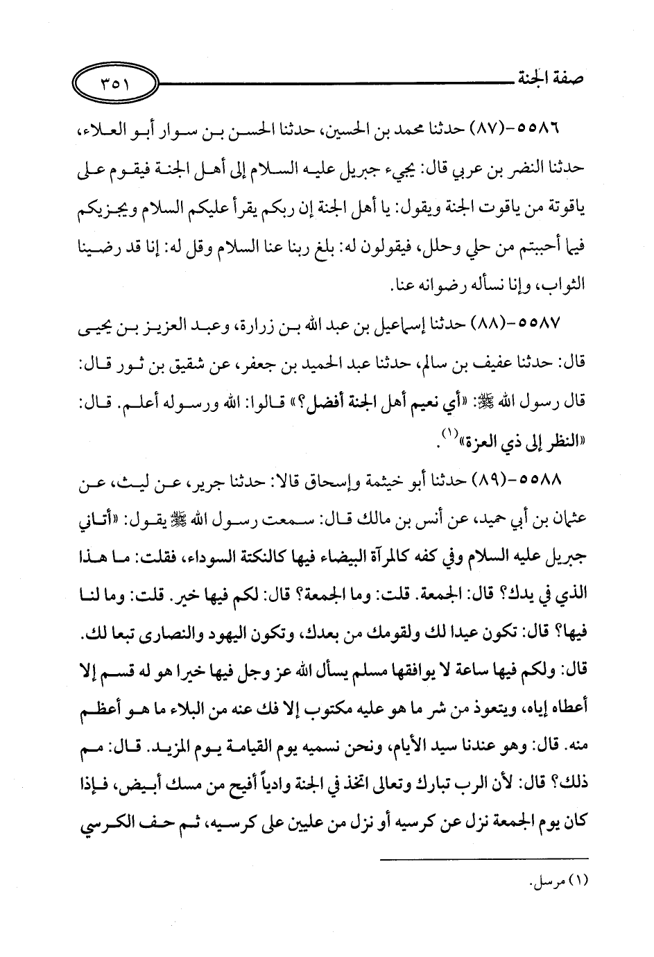 88 - حدثنا إسماعيل بن عبد الله بن زرارة وعبد العزيز بن يحيى قالا, حدثنا عفيف بن سالم, حدثنا عبد الحميد بن جعفر عن شقيق بن ثور قال قال رسول الله صلى الله عليه وسلم أي نعيم أهل الجنة أفضل قالوا الله ورسوله أعلم. قال النظر إلى ذي العزة.