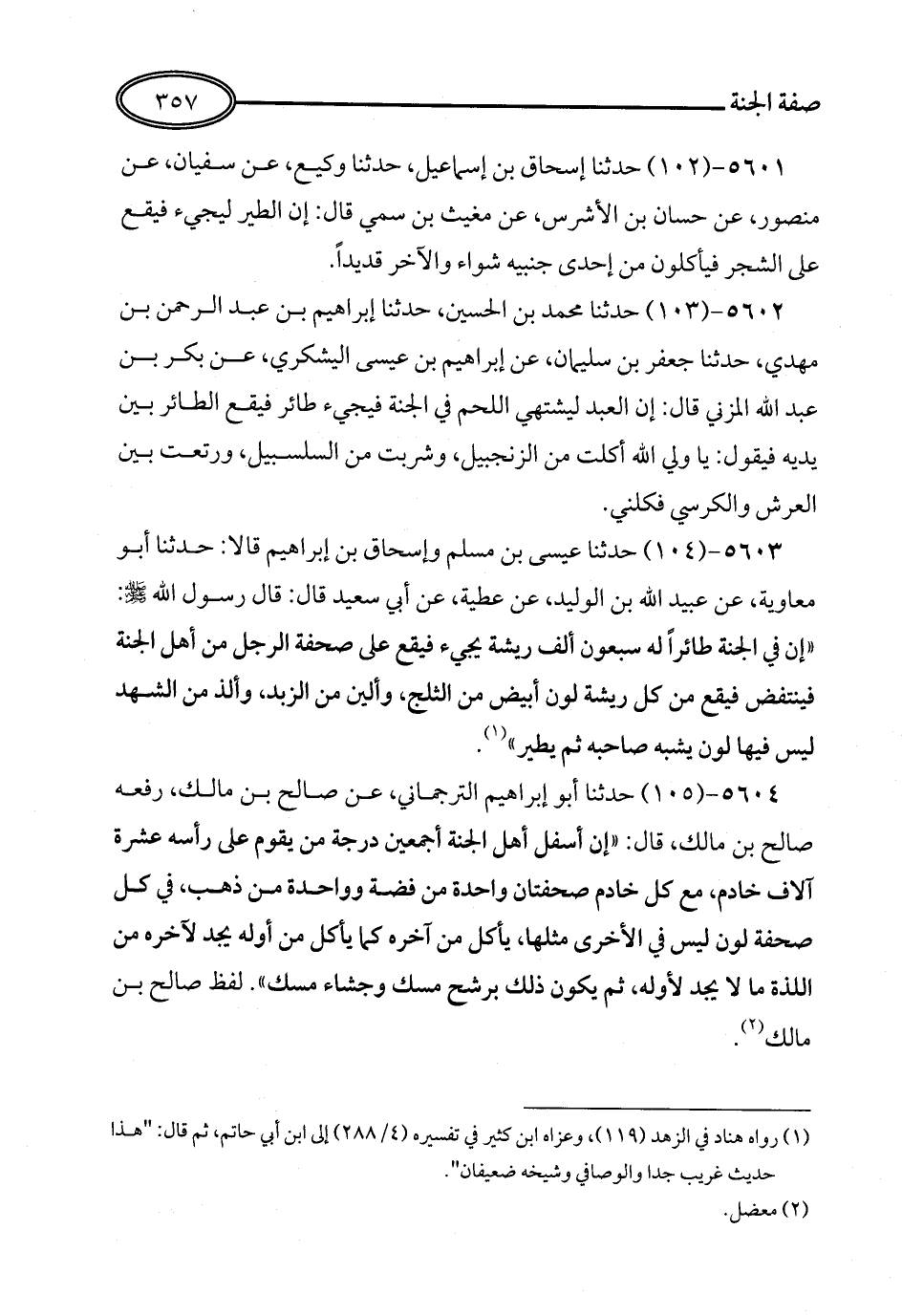 104 - حدثنا عيسى بن مسلم وإسحاق بن إبراهيم قالا, حدثنا أبو معاوية عن عبيد بن الوليد عن عطية عن أبي سعيد الخدري قال قال رسول الله صلى الله عليه وسلم إن في الجنة طائرا له سبعون ألف ريشة يجيء فيقع على صحفة الرجل من أهل الجنة فينتفض فيقع من كل ريشة لون أبيض من الثلج وألين من الزبد وألذ من الشهد ليس فيها لون يشبه صاحبه ثم يطير.