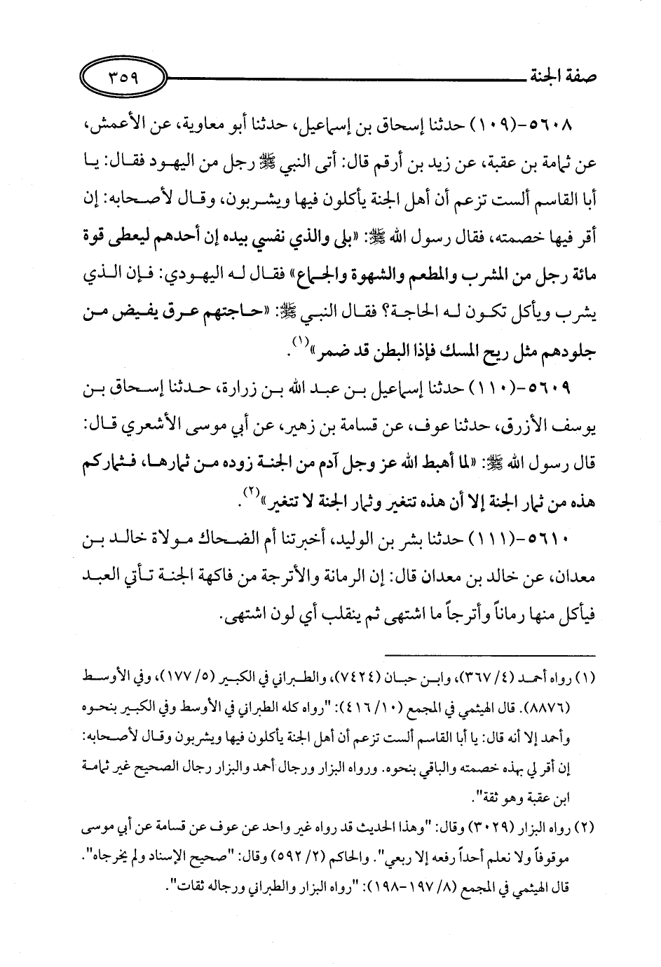 109 - حدثنا إسحاق بن إسماعيل, حدثنا أبو معاوية عن الأعمش عن ثمامة بن عقبة عن زيد بن أرقم قال أتى النبي صلى الله عليه وسلم رجل من اليهود فقال يا أبا القاسم ألست تزعم أن أهل الجنة يأكلون فيها ويشربون وقال لأصحابه إن أقرفيها خصمته فقال رسول الله صلى الله عليه وسلم بلى والذي نفسي بيده إن أحدهم ليعطي قوة مائة رجل من المشرب والمطعم والشهوة والجماع. فقال اليهودي فإن الذي يأكل ويشرب تكون له حاجة فقال النبي صلى الله عليه وسلم حاجتهم عرق يفيض من جلودهم مثل ريح المسك فإذا البطن قد ضمر.