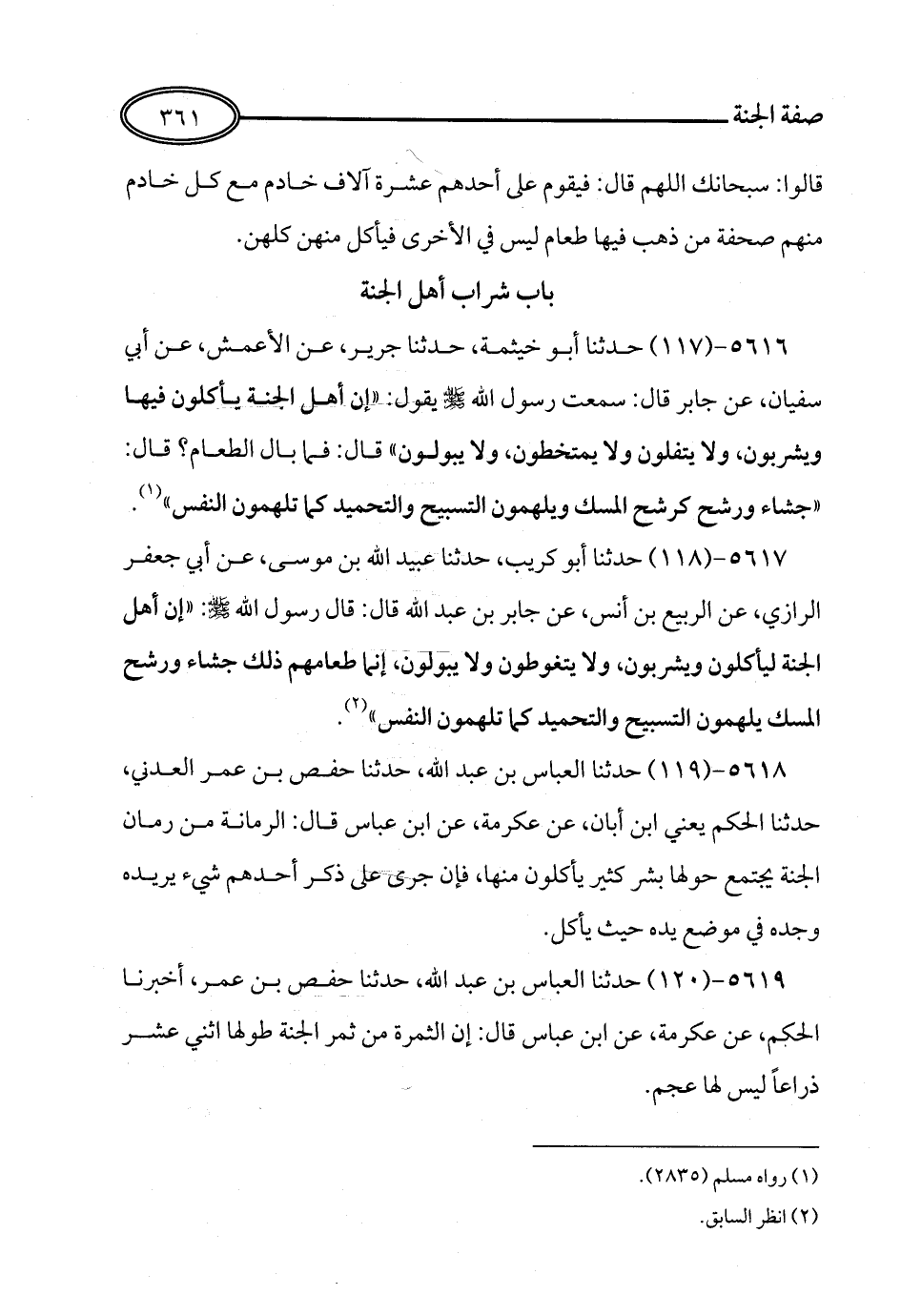 117 - حدثنا أبو خيثمة, حدثنا جرير عن الأعمش عن أبي سفيان عن جابر قال سمعت رسول الله صلى الله عليه وسلم يقول إن أهل الجنة يأكلون فيها ويشربون ولا يتفلون ولا يتمخطون ولا يبولون قال فما بال الطعام قال جشاء ورشح كرشح المسك يلهمون التسبيح والتحميد كما تلهمون النفس.
