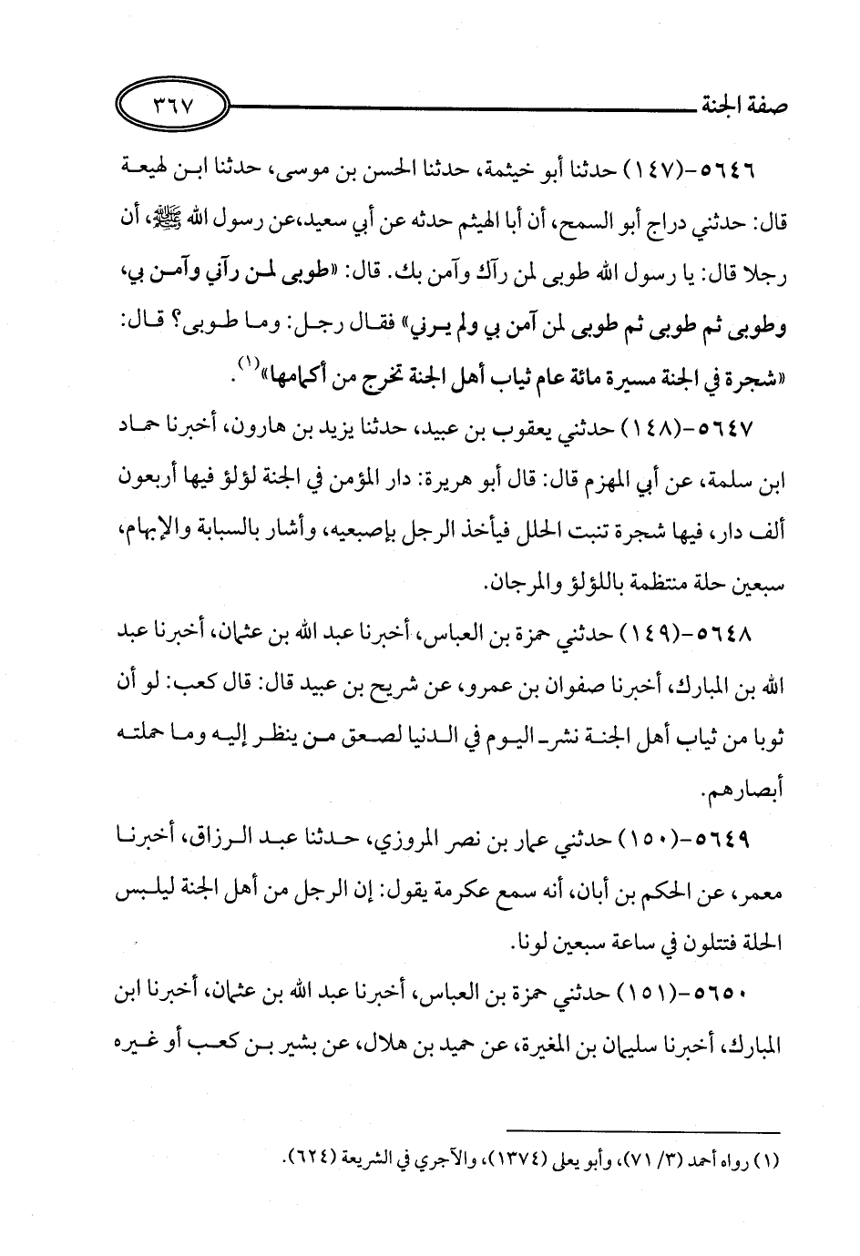 147 - حدثنا أبو خيثمة, حدثنا الحسن بن موسى, حدثنا ابن لهيعة حدثني دراج أبو السمح أن أبا الهيثم حدثه عن أبي سعيد أن رجلا قال يا رسول الله طوبى لمن رآك وآمن بك.قال طوبى لمن رآني وآمن بي وطوبى ثم طوبى ثم طوبى لمن آمن بي ولم يراني.فقال رجل وما طوبى قال شجرة في الجنة مسيرة مائة عام ثياب أهل الجنة تخرج من أكمامها.
