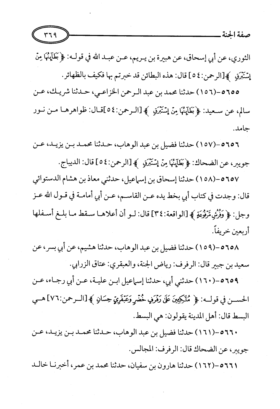 159 - حدثنا فضيل بن عبد الوهاب, حدثنا هشيم عن أبي بسر عن سعيد بن جبير قال الرفرف رياض الجنة والعبقري عتاق الزرابي.