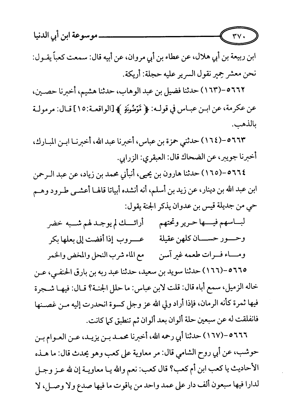 165 - حدثنا هارون بن يحيى أنبأني محمد بن زياد عن عبد الرحمن بن عبد الله بن دينار عن زيد بن أسلم أنه أنشده أبياتا قالها أعشى طرود وهم حي من حديلة قيس بن عدوان يذكر الجنة يقول