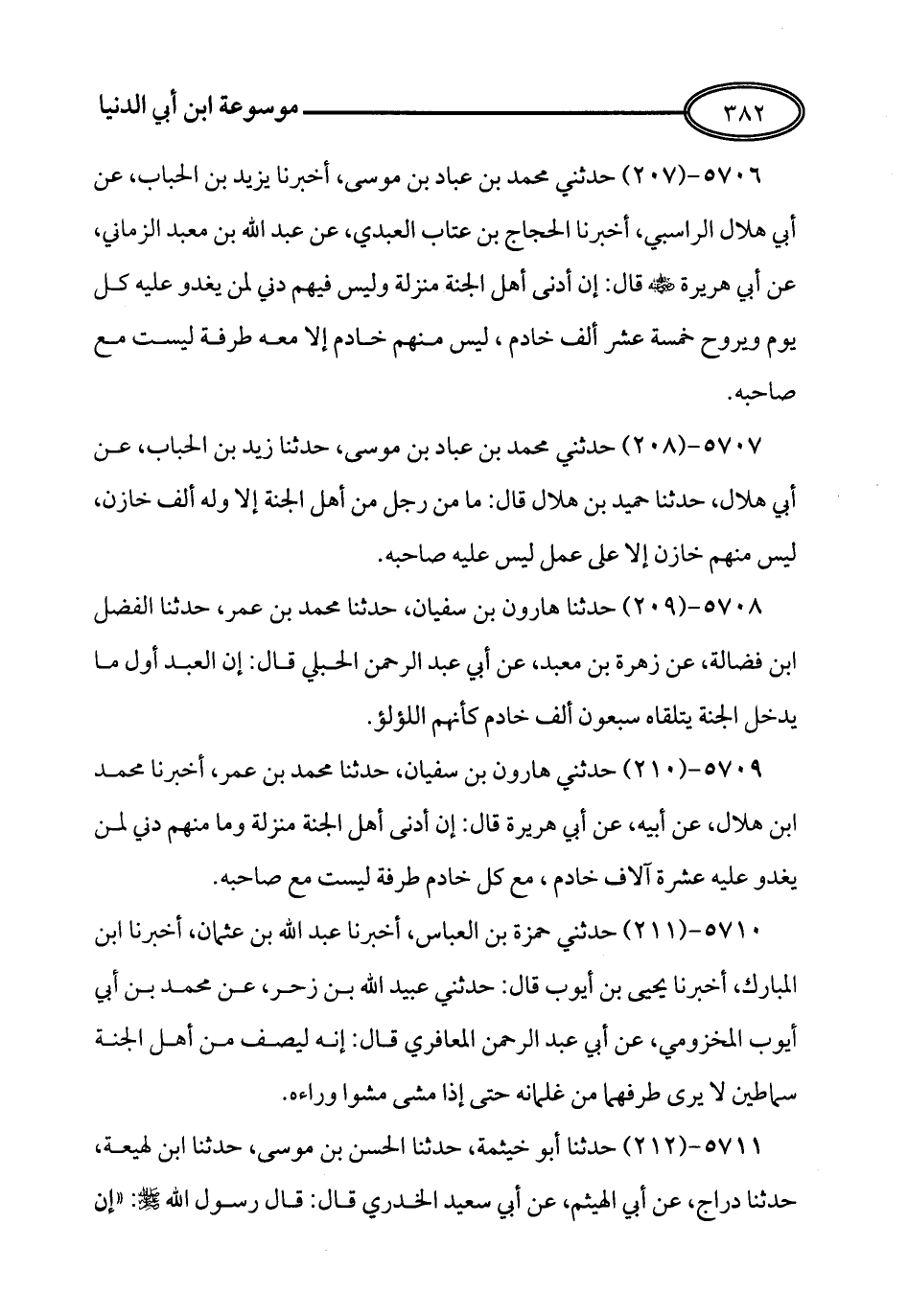 207 - حدثني محمد بن عباد بن موسى أخبرنا زيد بن الحباب عن أبي هلال الراسبي أخبرنا الحجاج بن عتاب العبدي عن عبد الله بن معبد الزماني عن أبي هريرة قال أدنى أهل الجنة منزلة وليس منهم دني لمن يغدو عليه كل يوم ويروح خمسة عشر ألف خادم. ليس منهم خادم إلا معه طرفة ليست مع صاحبه.