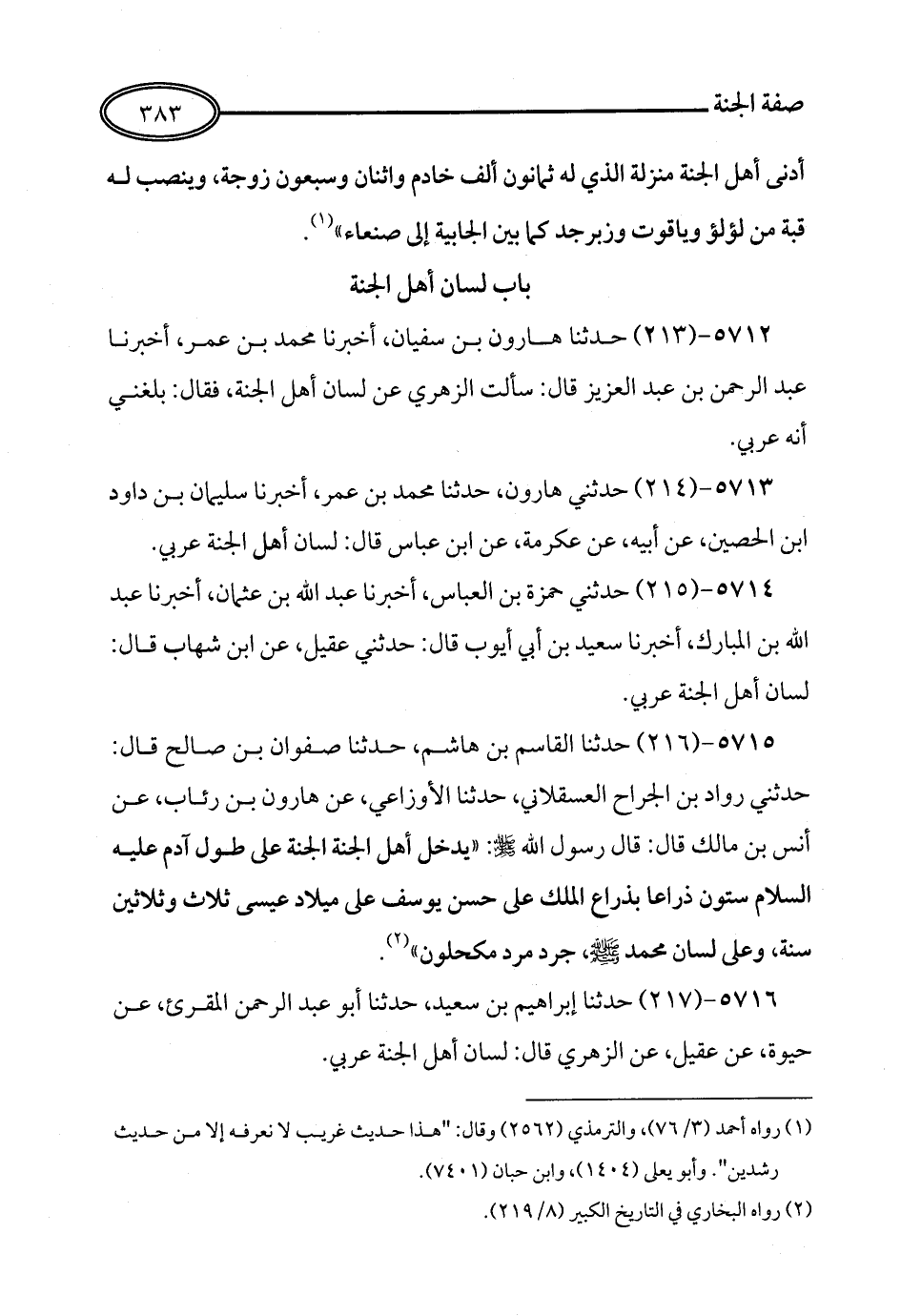 215 - حدثنا حمزة بن العباس أخبرنا عبد الله بن عثمان أخبرنا عبد الله بن المبارك أخبرنا سعيد بن أبي أيوب, قال: حدثني عقيل عن ابن شهاب قال لسان اهل الجنة عربي.