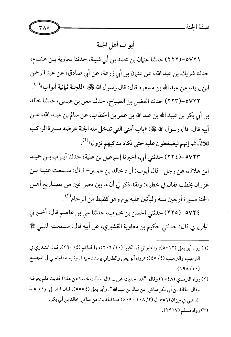 225 - حدثني الحسن بن محبوب, حدثنا علي بن عاصم قال أخبرني الجريري, قال: حدثني حكيم بن معاوية القشيري عن أبيه قال سمعت النبي صلى الله عليه وسلم يقول بين كل مصراعين من مصاريع الجنة مسيرة سبع سنين.