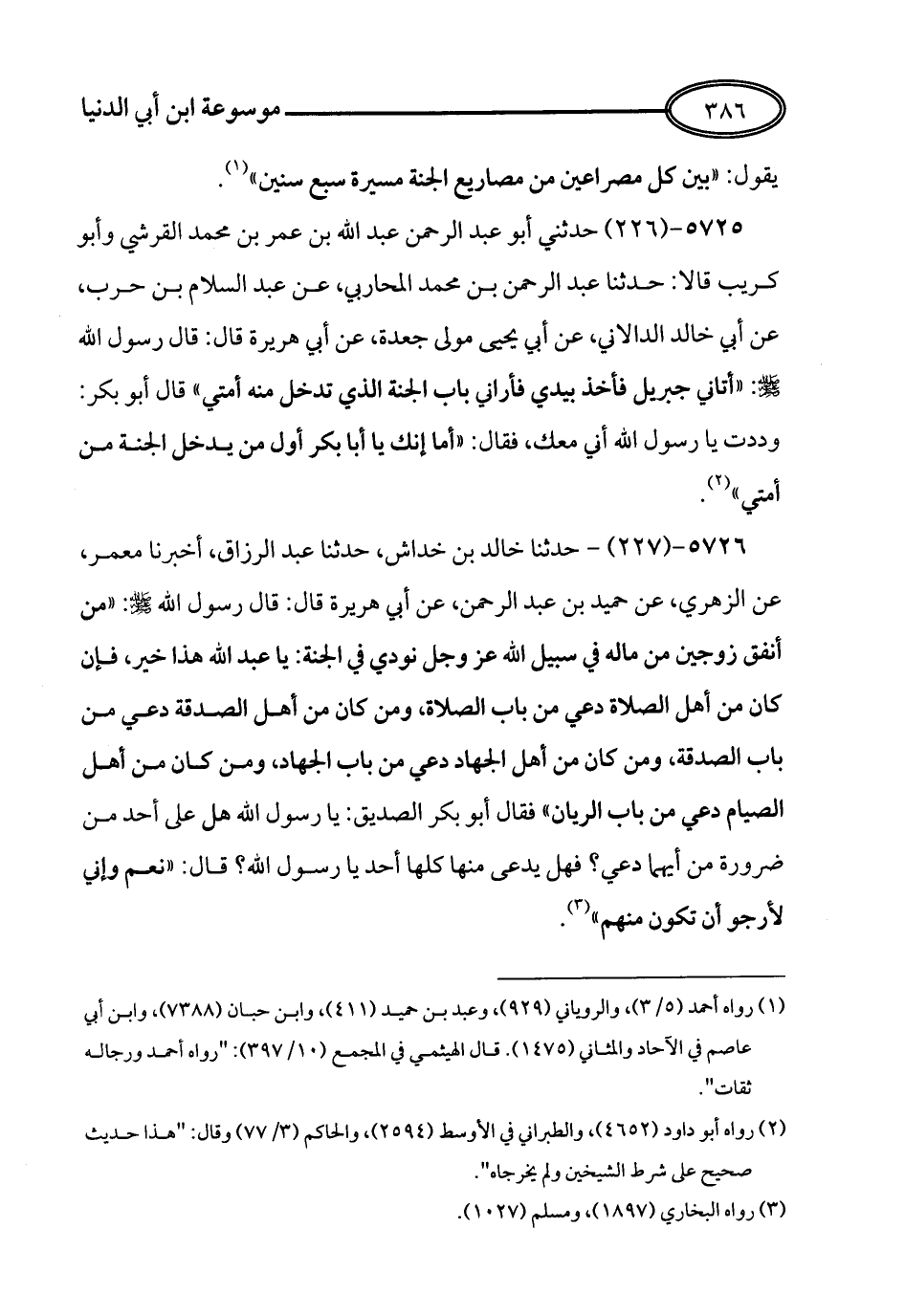 227 - حدثنا خالد بن خداش, حدثنا عبد الرزاق أخبرنا معمر عن الزهري عن حميد بن عبد الرحمن عن أبي هريرة قال قال رسول الله صلى الله عليه وسلم من أنفق زوجين من ماله في سبيل الله عز وجل نودي في الجنة يا عبد الله هذا خيرفإن كان من أهل الصلاة دعي من باب الصلاة ومن كان من أهل الصدقة دعي من باب الصدقة ومن كان من أهل الجهاد دعي من باب الجهاد ومن كان من أهل الصيام دعي من باب الريان. فقال أبو بكر الصديق يا رسول الله هل على أحد من ضرورة من أيهما دعي وهل يدعى منها كلها أحد يا رسول الله قال نعم وإني لأرجو أن تكون منهم.
