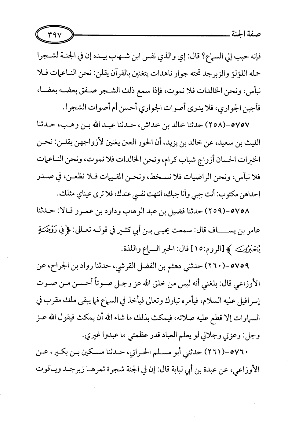258 - حدثنا خالد بن خداش, حدثنا عبد الله بن وهب, حدثنا الليث بن سعيد عن خالد بن يزيد أن الحور العين يغنين لأزواجهن يقلن نحن الخيرات الحسان أزواج شبان كرام ونحن الخالدات فلا نموت ونحن الناعمات فلا نبأس ونحن الراضيات فلا نسخط ونحن المقيمات فلا نظعن. في صدر إحداهن مكتوب أنت حبي وأنا حبك انتهت نفسي عندك فلا ترى عيناي مثلك.
