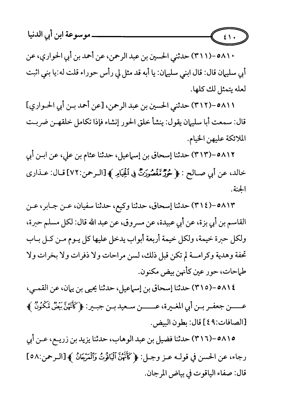 312 - حدثني الحسين بن عبد الرحمن عن أحمد بن أبي الحواري قال سمعت أبا سليمان يقول ينشأ خلق الحور إنشاء فإذا تكامل خلقهن ضربت الملائكة عليهن الخيام.