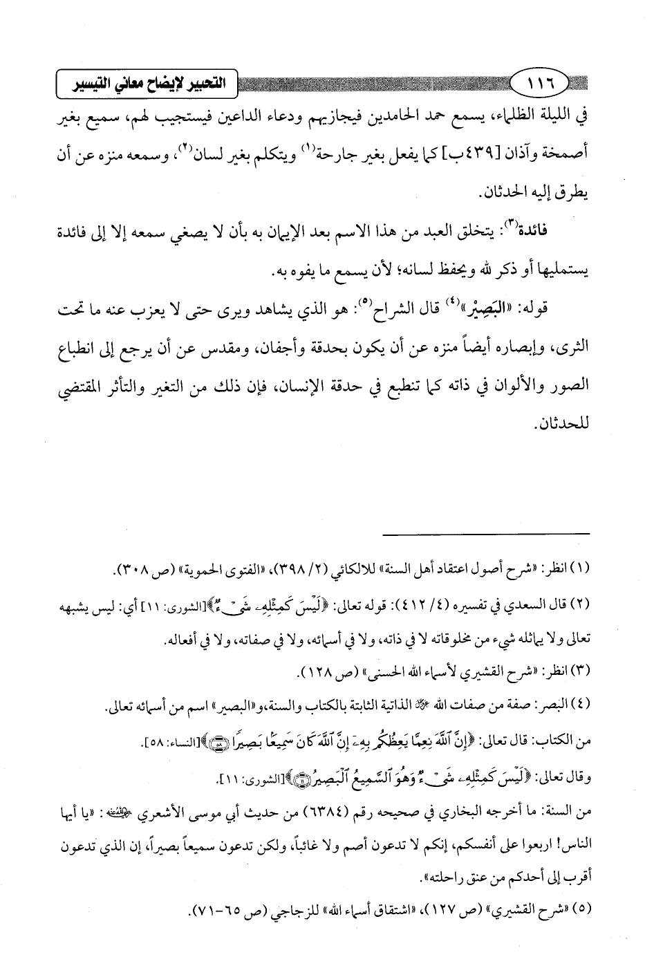 (¬4) البصر: صفة من صفات الله - عز وجل - الذاتية الثابتة بالكتاب والسنة، و"البصير" اسم من أسمائه تعالى.
