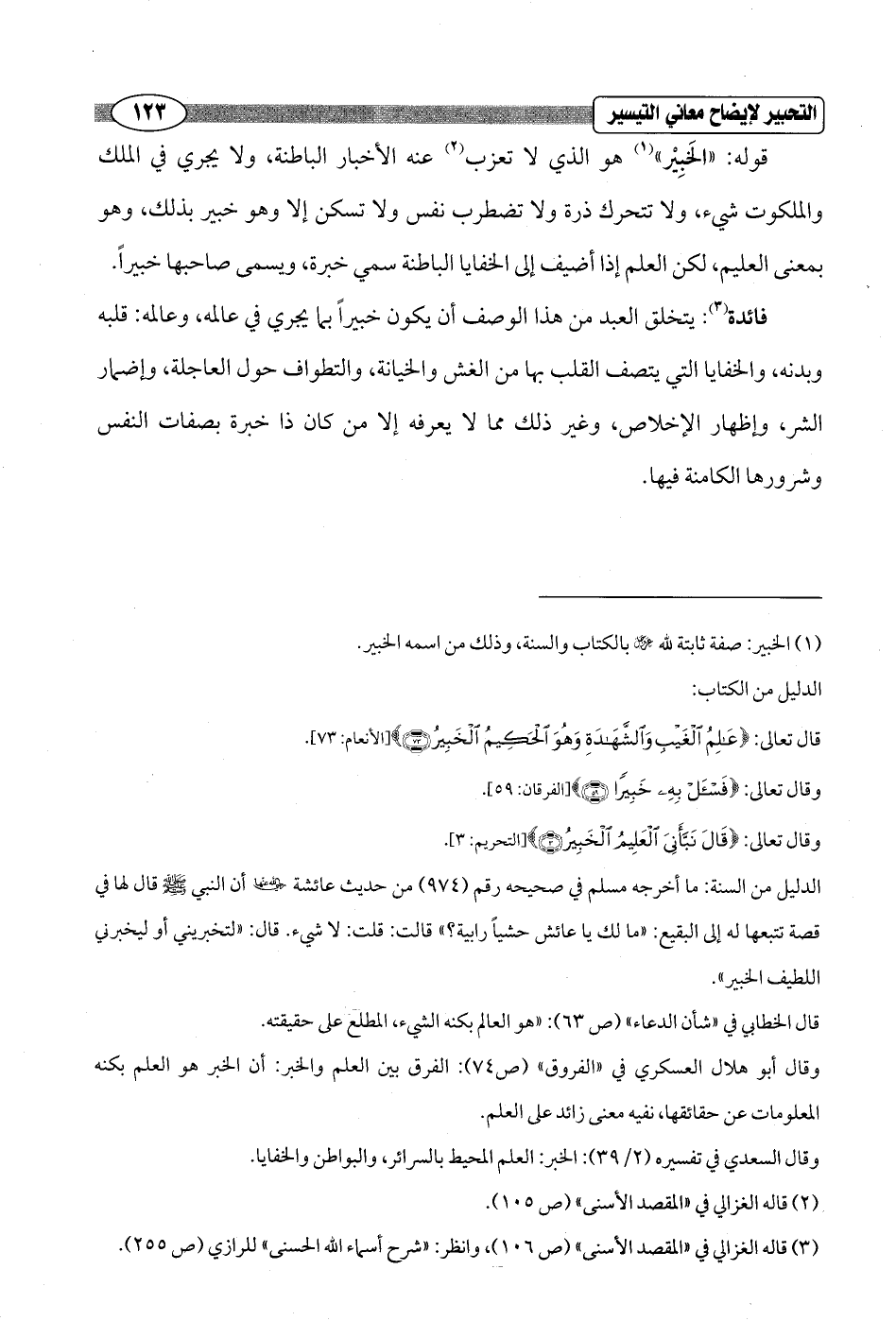 (¬1) الخبير: صفة ثابتة لله - عز وجل - بالكتاب والسنة، وذلك من اسمه الخبير.