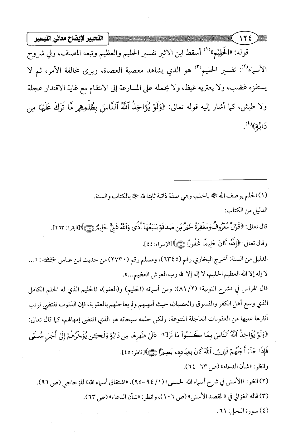 قال الهراس في "شرح النونية" (2/ 81): ومن أسمائه (الحليم) و (العفو)، فالحليم الذي له الحلم الكامل الذي وسع أهل الكفر والفسوق والعصيان، حيث أمهلهم ولم يعاجلهم بالعقوبة، فإن الذنوب تقتضي ترتب آثارها عليها من العقوبات العاجلة المتنوعة، ولكن حلمه سبحانه هو الذي اقتضى إمهالهم، كما قال تعالى: {وَلَوْ يُؤَاخِذُ اللَّهُ النَّاسَ بِمَا كَسَبُوا مَا تَرَكَ عَلَى ظَهْرِهَا مِنْ دَابَّةٍ وَلَكِنْ يُؤَخِّرُهُمْ إِلَى أَجَلٍ مُسَمًّى فَإِذَا جَاءَ أَجَلُهُمْ فَإِنَّ اللَّهَ كَانَ بِعِبَادِهِ بَصِيرًا (45)} [فاطر: 45].
