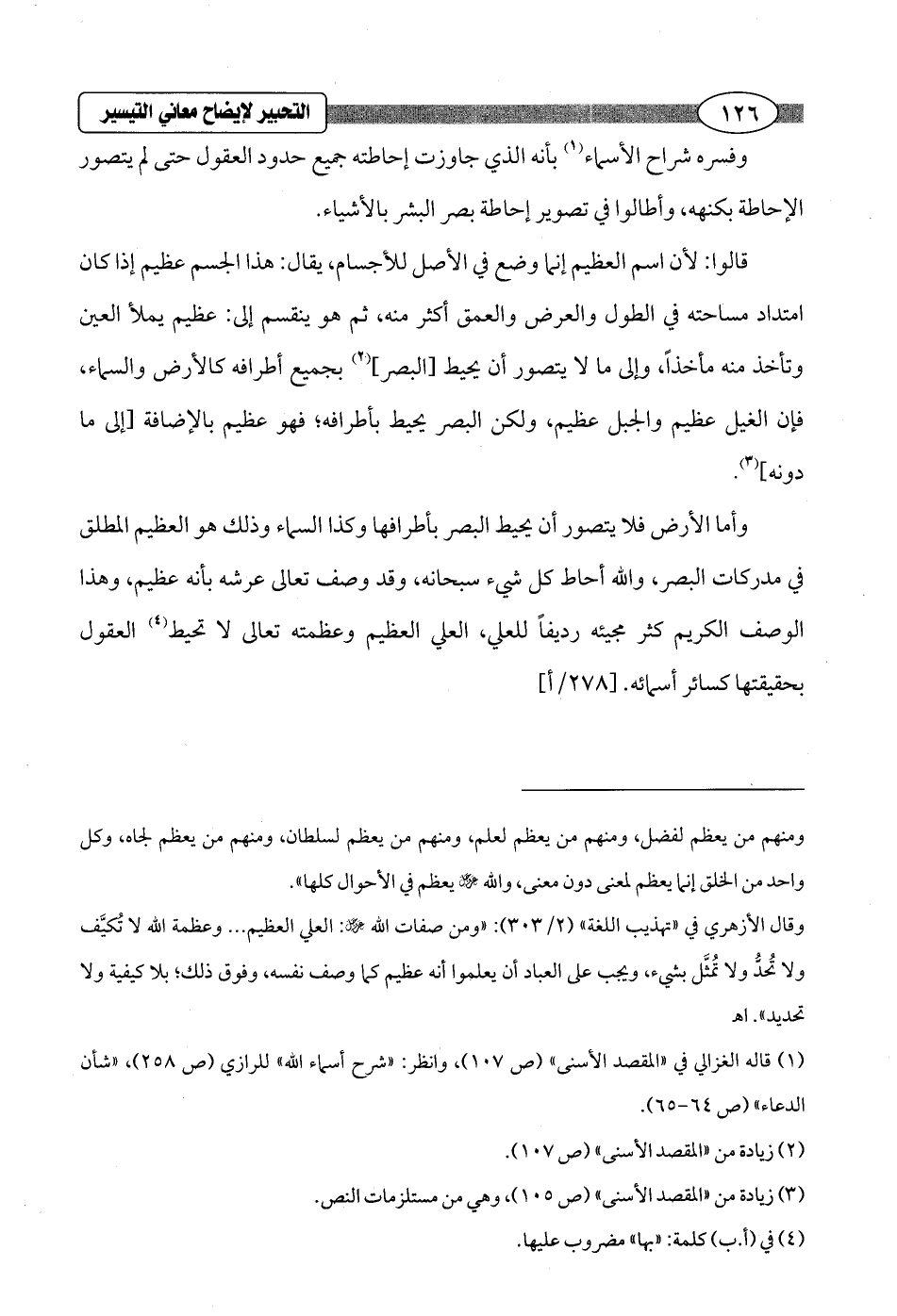 وأما الأرض فلا يتصور أن يحيط البصر بأطرافها وكذا السماء وذلك هو العظيم المطلق في مدركات البصر، والله أحاط كل شيء سبحانه، وقد وصف تعالى عرشه بأنه عظيم، وهذا الوصف الكريم أكثر مجيئه رديفاً للعلي، العلي العظيم وعظمته تعالى لا تحيط (¬4) العقول بحقيقتها كسائر أسمائه. [278/ أ]