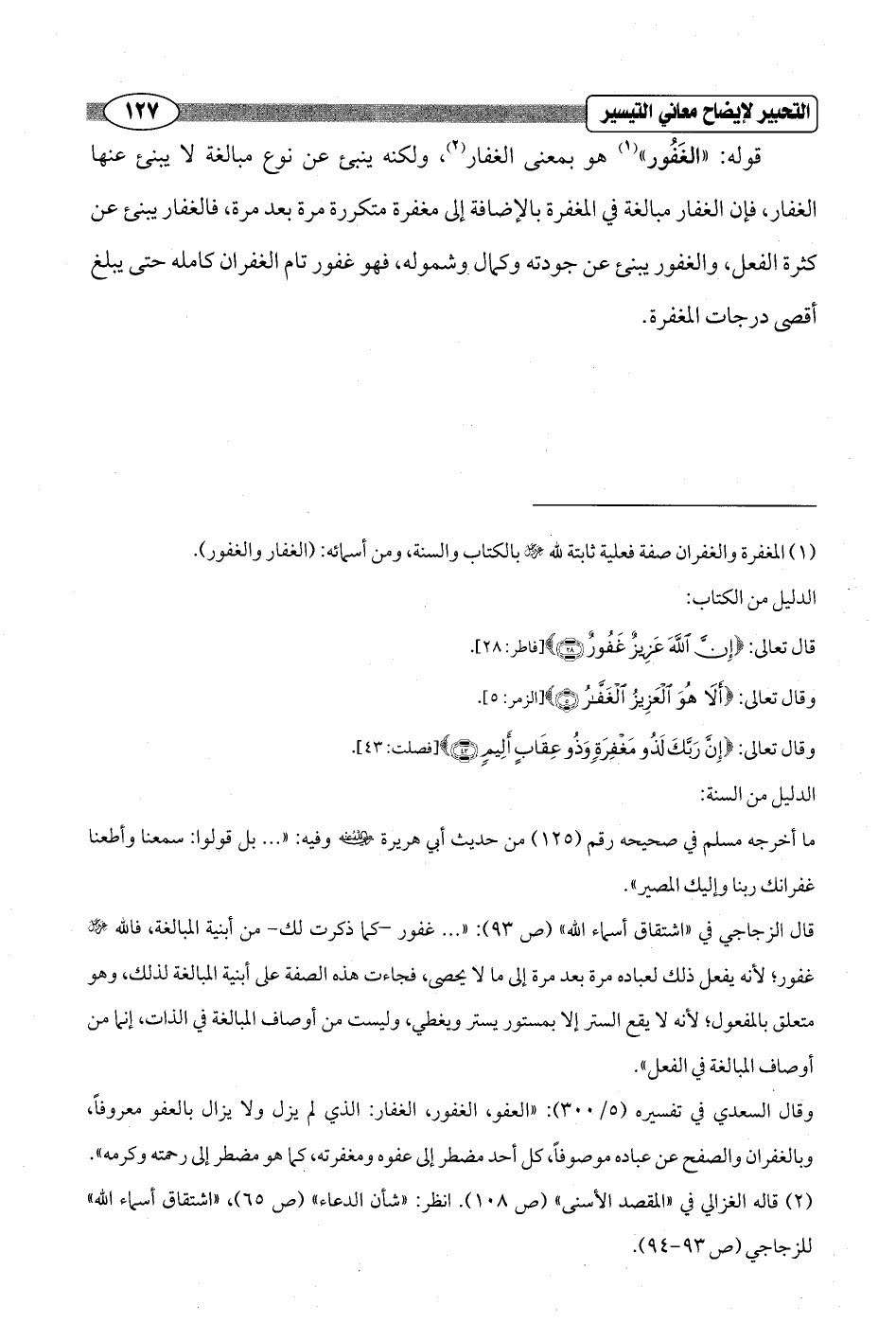 قال الزجاجي في "اشتقاق أسماء الله" (ص 93): " ... غفور - كما ذكرت لك - من أبنية المبالغة، فالله - عز وجل - غفور؛ لأنه يفعل ذلك لعباده مرة بعد مرة إلى ما لا يحصى، فجاءت هذه الصفة على أبنية المبالغة لذلك، وهو متعلق بالمفعول؛ لأنه لا يقع الستر إلا بمستور يستر ويغطي، وليست من أوصاف المبالغة في الذات، إنما من أوصاف المبالغة في الفعل".