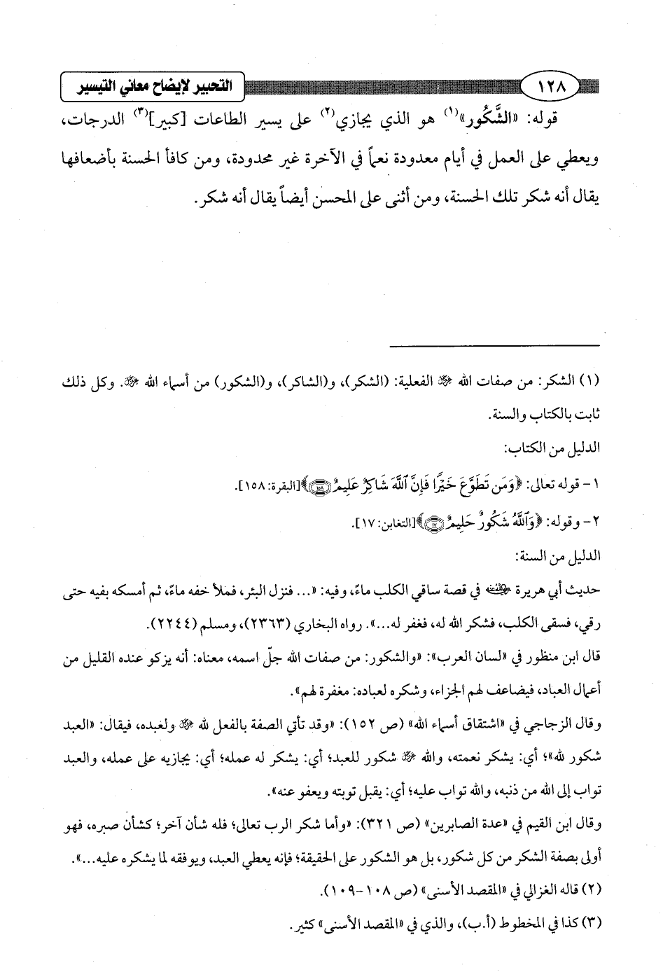 (¬1) الشكر: من صفات الله - عز وجل - الفعلية: (الشكر)، و (الشاكر)، و (الشكور) من أسماء الله - عز وجل -. وكل ذلك ثابت بالكتاب والسنة.