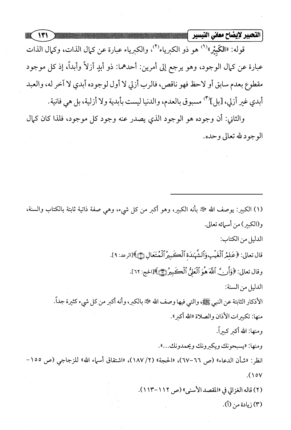(¬1) الكبير: يوصف الله - عز وجل - بأنه الكبير، وهو أكبر من كل شيء، وهي صفة ذاتية ثابتة بالكتاب والسنة، و (الكبير) من أسمائه تعالى.