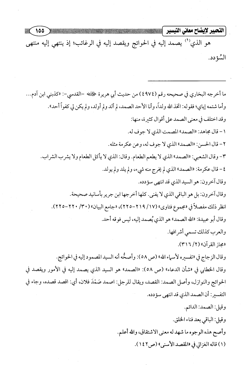 وقال الزجاج في "تفسيره لأسماء الله" (ص 58): وأصحُّه أنه السيد المصمود إليه في الحوائج.