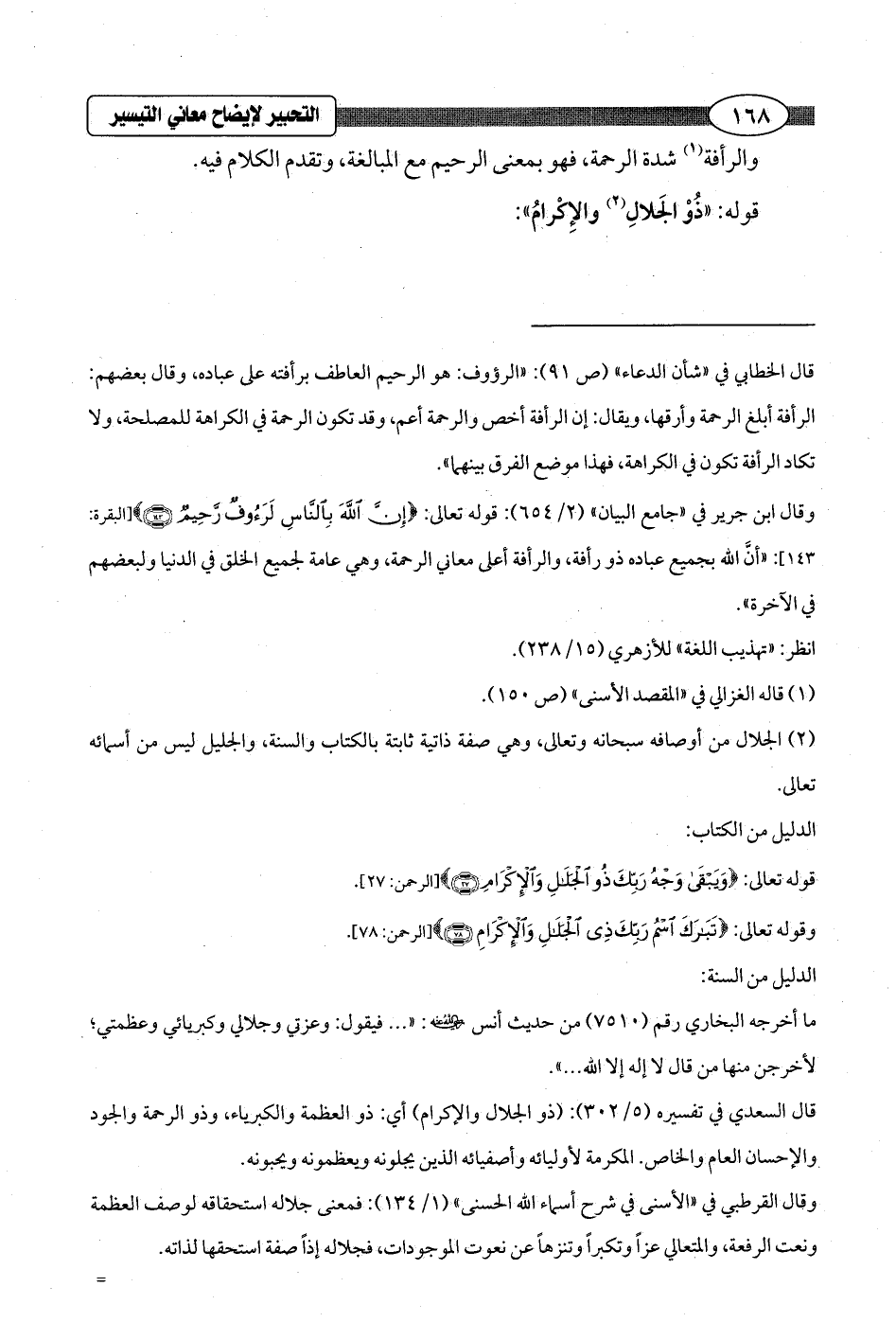 وقال القرطبي في "الأسنى في شرح أسماء الله الحسنى" (1/ 134): فمعنى جلاله استحقاقه لوصف العظمة ونعت الرفعة، والمتعالي عزاً وتكبراً وتنزهاً عن نعوت الموجودات، فجلاله إذًا صفة استحقها لذاته. =