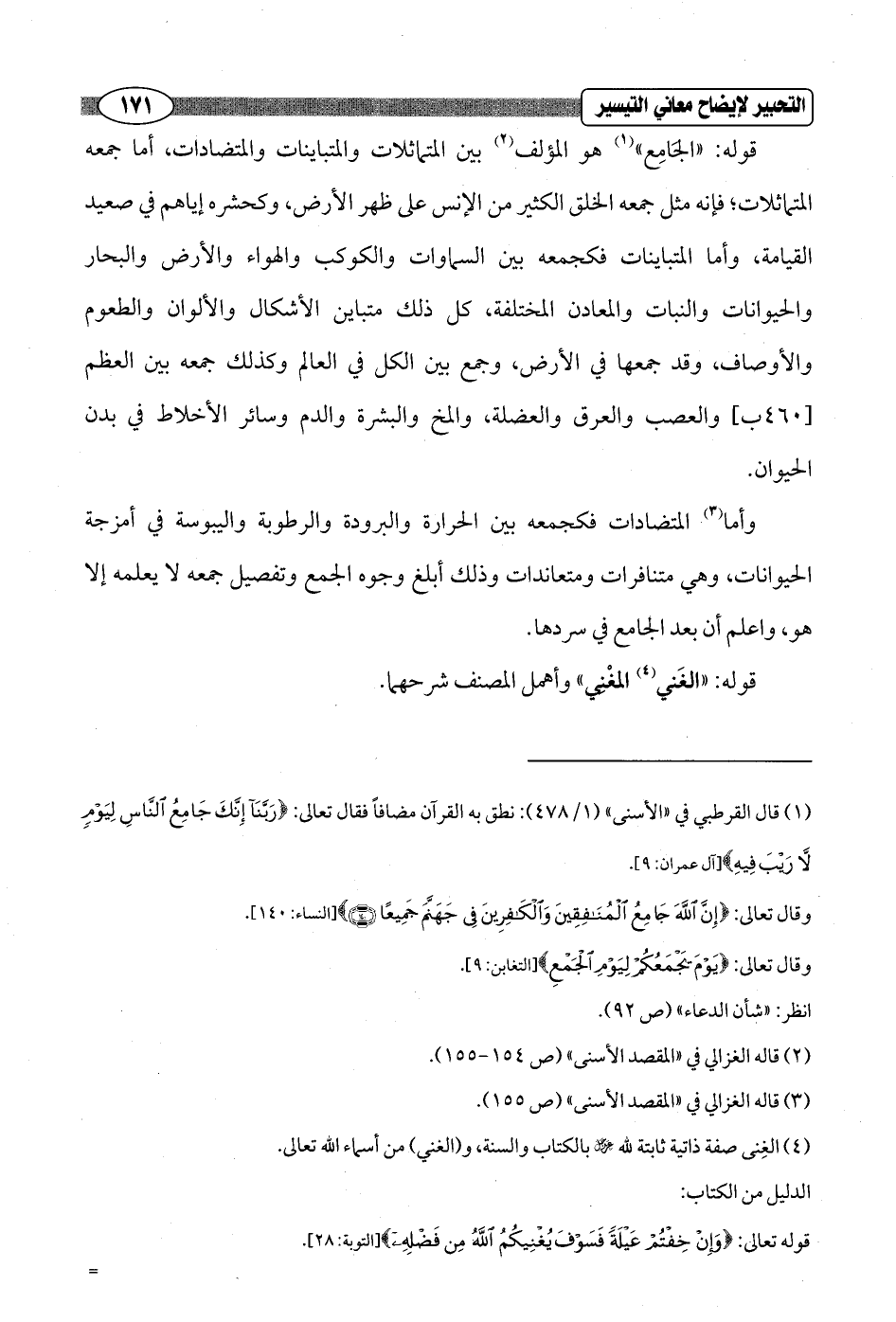 قوله: "الجَامِع" (¬1) هو المؤلف (¬2) بين المتماثلات والمتباينات والمتضادات، أما جمعه المتماثلات؛ فإنه مثل جمعه الخلق الكثير من الإنس على ظهر الأرض، وكحشره إياهم في صعيد القيامة، وأما المتباينات فكجمعه بين السماوات والكوكب والهواء والأرض والبحار والحيوانات والنبات والمعادن المختلفة، كل ذلك متباين الأشكال والألوان والطعوم والأوصاف، وقد جمعها في الأرض، وجمع بين الكل في العالم وكذلك جمعه بين العظم [460 ب] والعصب والعرق والعضلة، والمخ والبشرة والدم وسائر الأخلاط في بدن الحيوان.