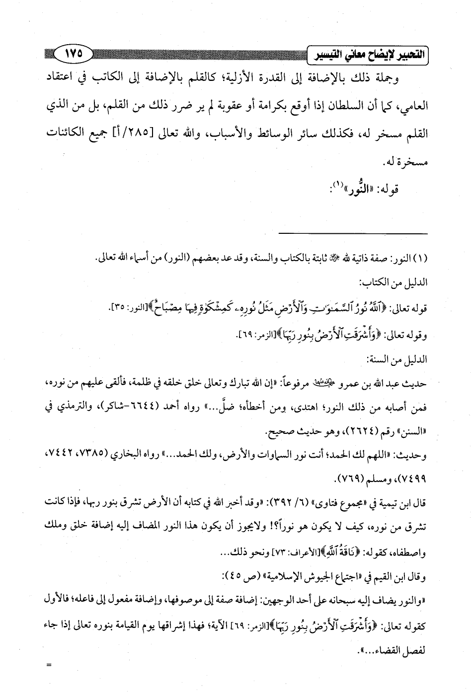 (¬1) النور: صفة ذاتية لله - عز وجل - ثابتة بالكتاب والسنة، وقد عد بعضهم (النور) من أسماء الله تعالى.