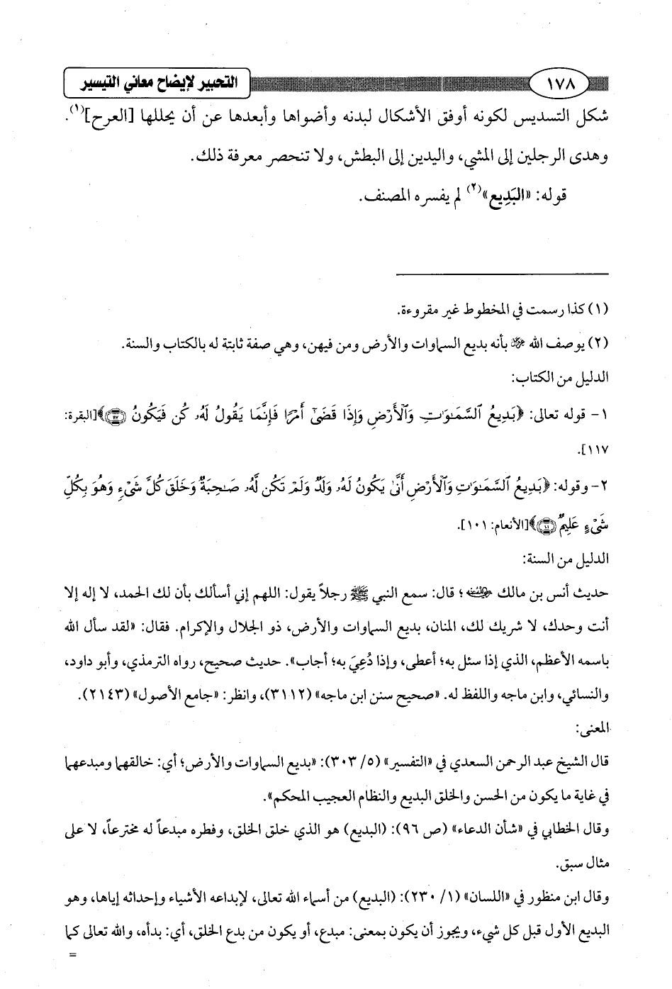 (¬2) يوصف الله - عز وجل - بأنه بديع السماوات والأرض ومن فيهن، وهي صفة ثابتة له بالكتاب والسنة.