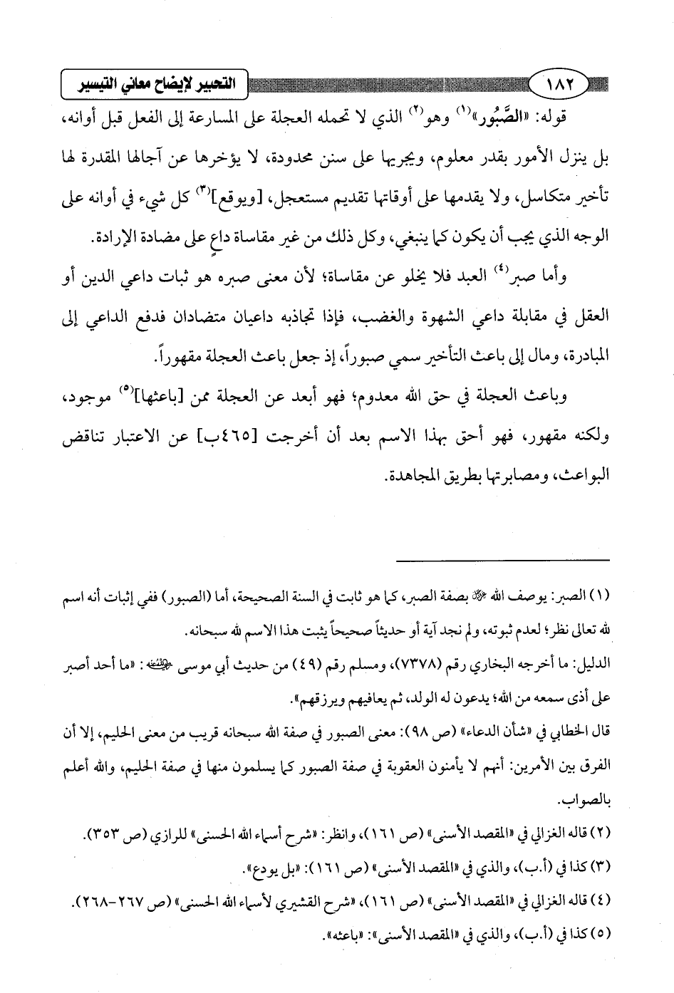 (¬1) الصبر: يوصف الله - عز وجل - بصفة الصبر، كما هو ثابت في السنة الصحيحة، أما (الصبور) ففي إثبات أنه اسم لله تعالى نظر؛ لعدم ثبوته، ولم نجد آية أو حديثاً صحيحاً يثبت هذا الاسم لله سبحانه.