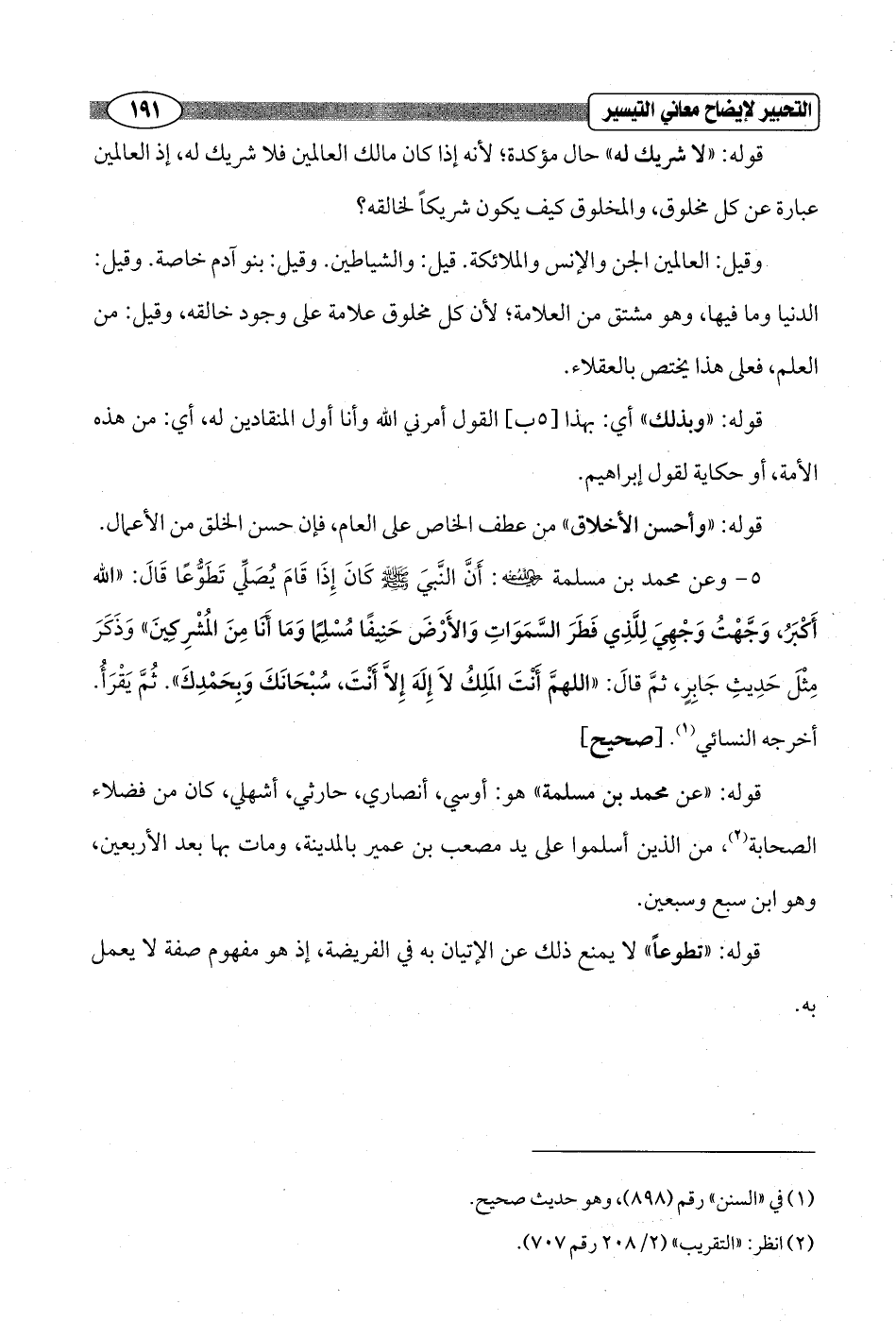5 - وعن محمد بن مسلمة - رضي الله عنه -: أَنَّ النَّبيَ - صلى الله عليه وسلم - كَانَ إِذَا قَامَ يُصَلِّي تَطَوُّعًا قَالَ: "الله أَكْبَرُ، وَجَّهْتُ وَجْهِيَ لِلَّذِي فَطَرَ السَّمَوَاتِ وَالأَرْضَ حَنِيفًا مُسْلِمًا وَمَا أَنَا مِنَ المُشْرِكِينَ" وَذَكَرَ مِثْلَ حَدِيثِ جَابِرٍ، ثمَّ قَالَ: "اللهمَّ أَنْتَ المَلِكُ لاَ إِلَهَ إِلاَّ أَنْتَ، سُبْحَانَكَ وَبِحَمْدِك". ثُمَّ يَقْرَأُ. أخرجه النسائي (¬1). [صحيح]