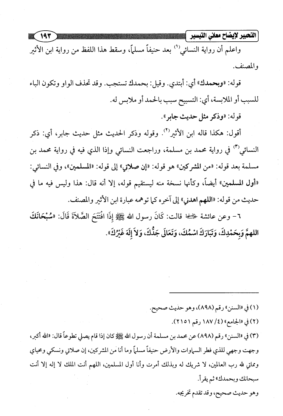 (¬3) في "السنن" رقم (898) عن محمد بن مسلمة أن رسول الله - صلى الله عليه وسلم - كان إذا قام يصلي تطوعاً قال: "الله أكبر، وجهت وجهي للذي فطر السماوات والأرض حنيفاً مسلماً وما أنا من المشركين، إن صلاتي ونسكي ومحياي ومماتي لله رب العالمين، لا شريك له وبذلك أمرت وأنا أول المسلمين، اللهم أنت الملك لا إله إلا أنت سبحانك وبحمدك" ثم يقرأ.