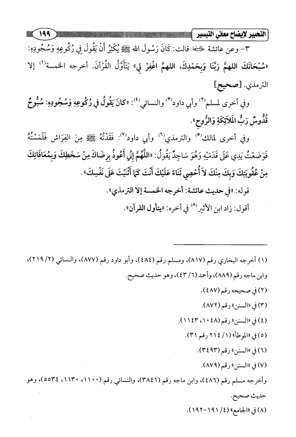 3 - وعن عائشة - رضي الله عنها - قالت: كَانَ رَسُولَ الله - صلى الله عليه وسلم - يُكْثِرُ أَنْ يَقُولَ فِي رُكُوعِهِ وَسُجُودِهِ: "سُبْحَانَكَ اللهمَّ رَبَّنَا وَبِحَمْدِكَ, اللهمَّ اغْفِرْ لِي" يَتَأَوَّلُ القُرْآنَ. أخرجه الخمسة (¬1) إلا الترمذي. [صحيح]