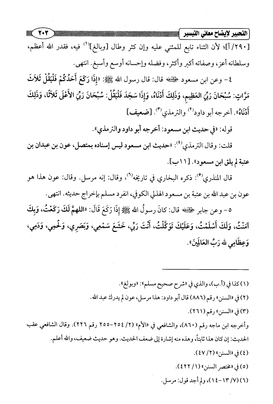 4 - وعن ابن مسعود - رضي الله عنه - قال: قال رسول الله - صلى الله عليه وسلم -: "إِذَا رَكَعَ أَحَدُكُمْ فَلْيَقُلْ ثَلاَثَ مَرَّاتٍ: سُبْحَانَ رَبِّيَ العَظِيمِ، وَذَلِكَ أَدْنَاهُ، وَإذَا سَجَدَ فَلْيَقُلْ: سُبْحَانَ رَبِّيَ الأَعْلَى ثَلاَثًا، وَذَلِكَ أَدْنَاهُ". أخرجه أبو داود (¬2) والترمذي (¬3). [ضعيف]