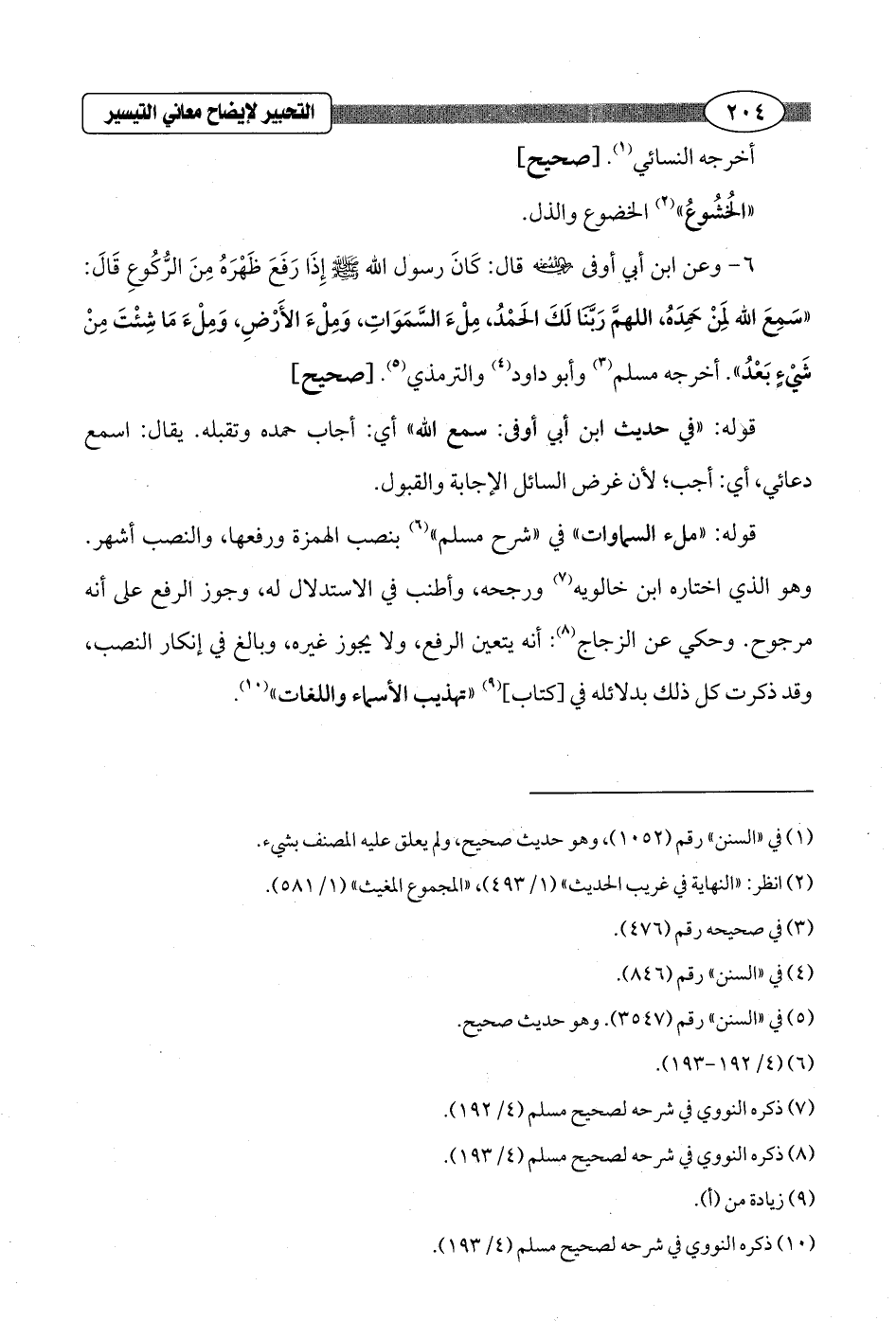 6 - وعن ابن أبي أوفى - رضي الله عنه - قال: كَانَ رسول الله - صلى الله عليه وسلم - إِذَا رَفَعَ ظَهْرَهُ مِنَ الرُّكُوعِ قَالَ: "سَمِعَ الله لمَنْ حَمِدَهُ، اللهمَّ رَبَّنَا لَكَ الحَمْدُ، مِلْءَ السَّمَوَاتِ، وَمِلْءَ الأَرْضِ، وَمِلْءَ مَا شِئْتَ مِنْ شَيْءٍ بَعْدُ". أخرجه مسلم (¬3) وأبو داود (¬4) والترمذي (¬5). [صحيح]