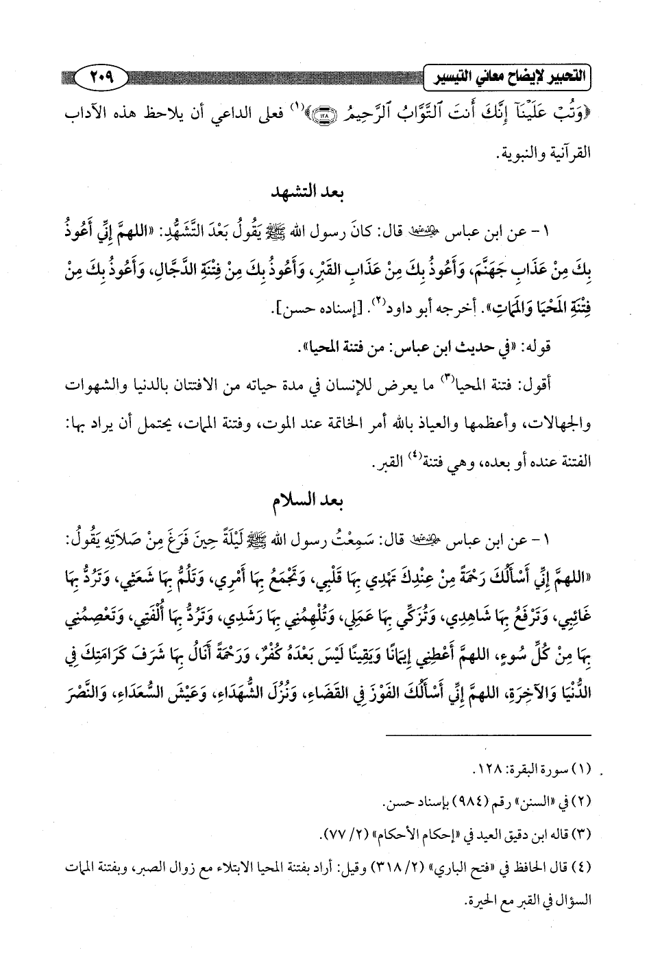 1 - عن ابن عباس - رضي الله عنهما - قال: كانَ رسول الله - صلى الله عليه وسلم - يَقُولُ بَعْدَ التَّشَهُّدِ: "اللهمَّ إِنِّي أَعُوذُ بِكَ مِنْ عَذَابِ جَهَنَّمَ، وَأَعُوذُ بِكَ مِنْ عَذَابِ القَبْرِ، وَأَعُوذُ بِكَ مِنْ فِتْنهِ الدَّجَّالِ، وَأَعُوذُ بِكَ مِنْ فِتْنهِ المَحْيَا وَالمَمَاتِ". أخرجه أبو داود (¬2). [إسناده حسن].