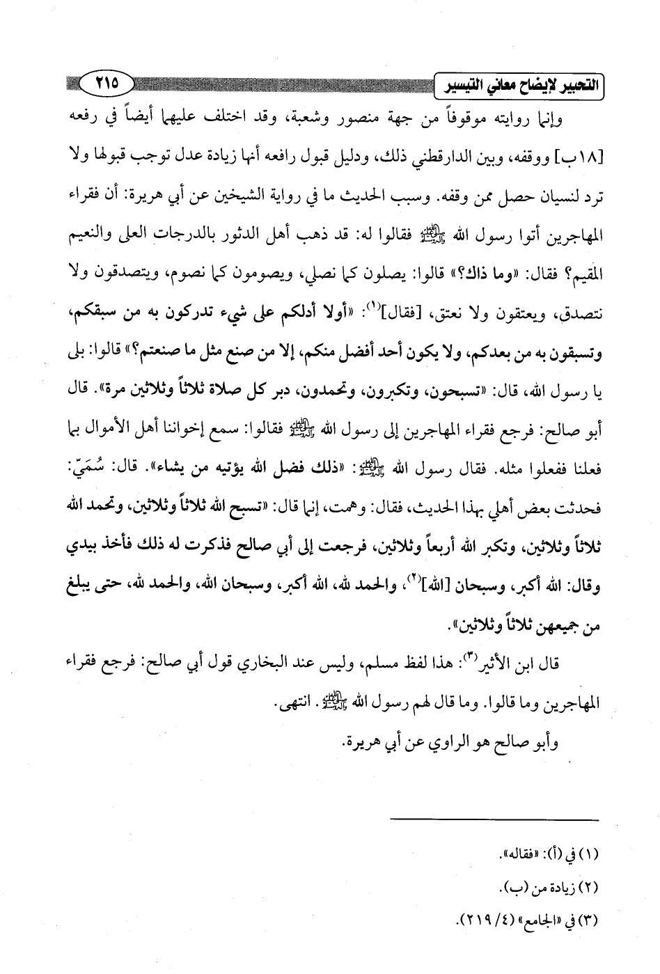 قال ابن الأثير (¬3): هذا لفظ مسلم، وليس عند البخاري قول أبي صالح: فرجع فقراء المهاجرين وما قالوا. وما قال لهم رسول الله - صلى الله عليه وسلم -. انتهى.
