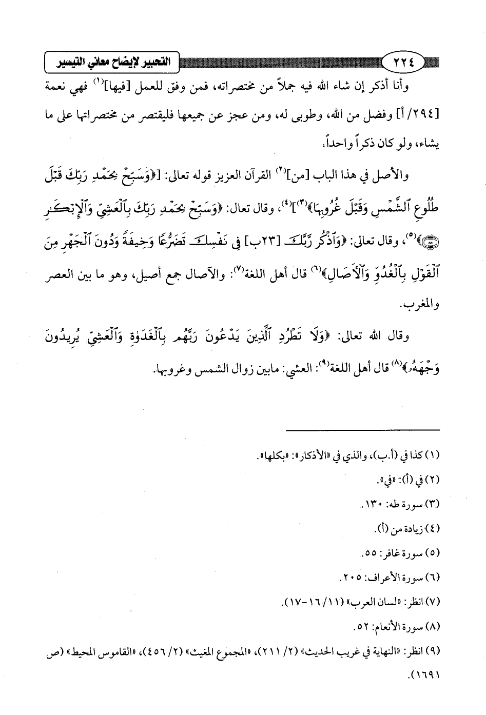 والأصل في هذا الباب [من] (¬2) القرآن العزيز قوله تعالى: [{وَسَبِّحْ بِحَمْدِ رَبِّكَ قَبْلَ طُلُوعِ الشَّمْسِ وَقَبْلَ غُرُوبِهَا} (¬3)] (¬4)، وقال تعال: {وَسَبِّحْ بِحَمْدِ رَبِّكَ بِالْعَشِيِّ وَالْإِبْكَارِ (55)} (¬5)، وقال تعالى: {وَاذْكُرْ رَبَّكَ [23 ب] فِي نَفْسِكَ تَضَرُّعًا وَخِيفَةً وَدُونَ الْجَهْرِ مِنَ الْقَوْلِ بِالْغُدُوِّ وَالْآصَالِ} (¬6) قال أهل اللغة (¬7): والآصال جمع أصيل، وهو ما بين العصر والمغرب.