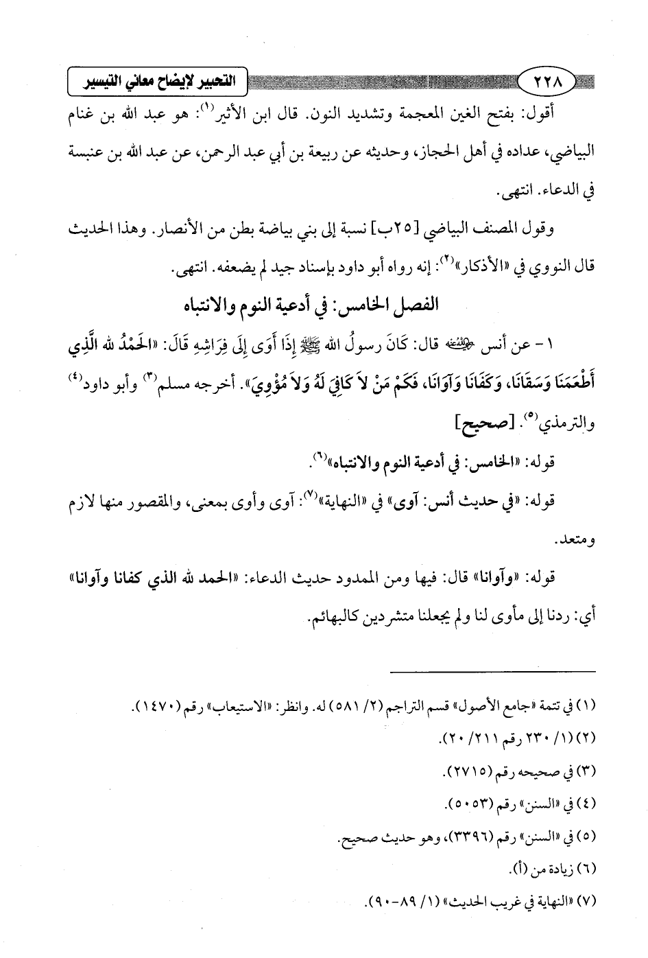 1 - عن أنس - رضي الله عنه - قال: كَانَ رسولُ الله - صلى الله عليه وسلم - إِذَا أَوَى إِلَى فِرَاشِهِ قَالَ: "الحَمْدُ لله الَّذِي أَطْعَمَنَا وَسَقَانَا، وَكَفَانَا وَآوَانَا، فَكَمْ مَنْ لاَ كَافِيَ لَهُ وَلاَ مُؤْوِيَ". أخرجه مسلم (¬3) وأبو داود (¬4) والترمذي (¬5). [صحيح]