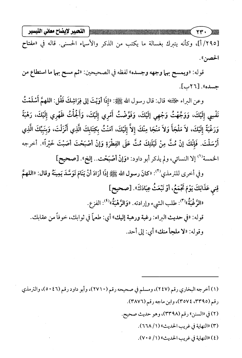 وعن البراء - رضي الله عنه - قال: قال رسول الله - صلى الله عليه وسلم -: "إِذَا أوَيْتَ إلى فرَاشِكَ فَقُل: اللهمَّ أَسْلَمْتُ نَفْسِي إِلَيْكَ، وَوَجَّهْتُ وَجْهِي إلَيْكَ، وَفَوَّضْتُ أَمْرِي إِلَيْكَ، وَأَلْجَأْتُ ظَهْرِي إِلَيْكَ، رَهْبَةً وَرَغْبَةً إِلَيْكَ، لاَ مَلْجَأَ وَلاَ مَنْجَا مِنْكَ إِلاَّ إِلَيْكَ، آمَنْتُ بِكِتَابِكَ الَّذِي أَنْزَلْتَ، وَبِنَبِيِّكَ الَّذِي أَرْسَلْتَ. فَإِنْكَ إنْ مُتَّ مِنْ لَيْلَتِكَ مُتَّ عَلَى الفِطْرَةِ وَإنْ أصْبَحْتَ أصَبْتَ خَيْرًا". أخرجه الخمسة (¬1) إلا النسائي، ولم يذكر أبو داود: "وَإنْ أصْبَحْت .. إلخ". [صحيح]