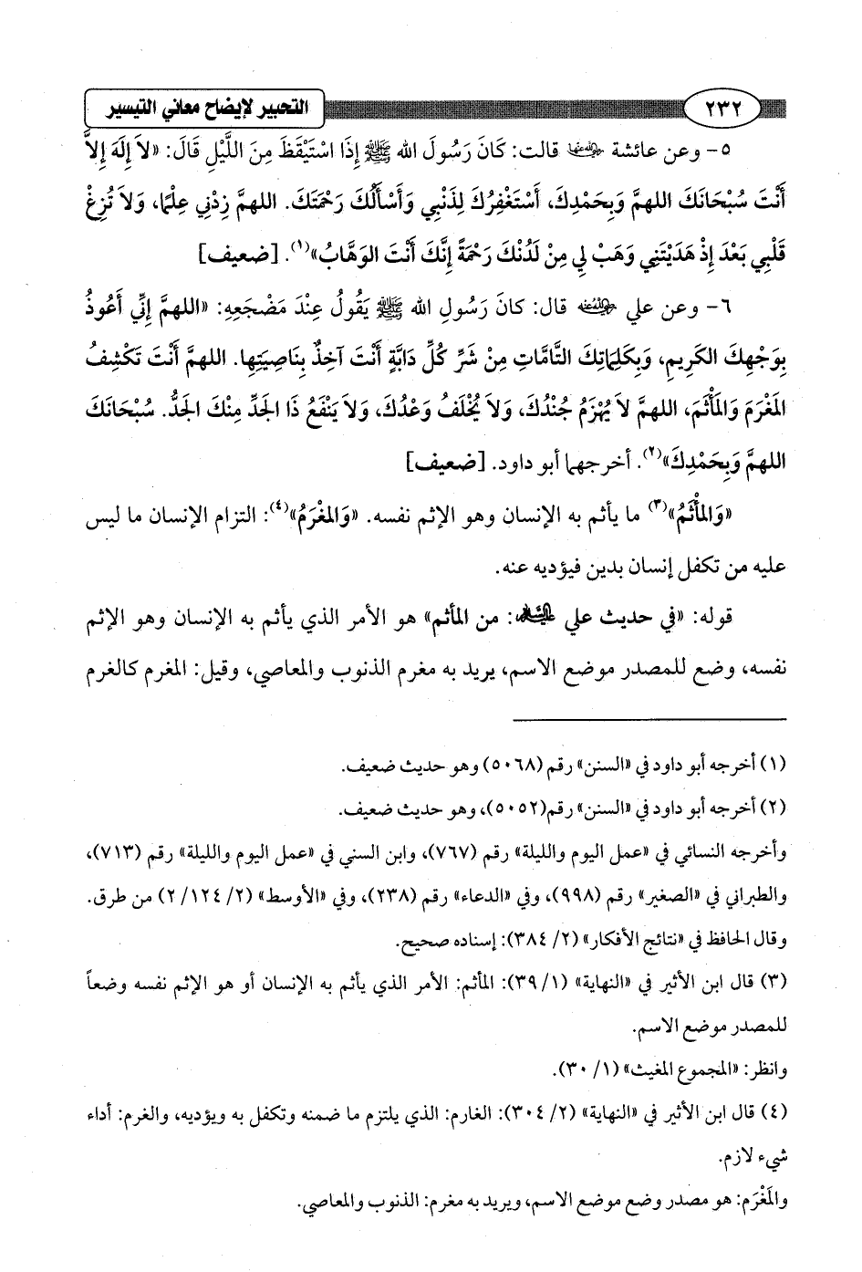 5 - وعن عائشة - رضي الله عنها - قالت: كَانَ رَسُولَ الله - صلى الله عليه وسلم - إِذَا اسْتَيْقَظَ مِنَ اللَّيْلِ قَالَ: "لاَ إِلَهَ إِلاَّ أَنْتَ سُبْحَانَكَ اللهمَّ وَبِحَمْدِكَ أَستَغْفِرُكَ لِذَنْبِي وَأَسْأَلُكَ رَحْمَتَكَ. اللهمَّ زِدْنِي عِلْمًا، وَلاَ تُزِغْ قَلْبِي بَعْدَ إِذْ هَدَيْتَنِي وَهَبْ لِي مِنْ لَدُنْكَ رَحْمَةً إِنَّكَ أَنْتَ الوَهَّابُ" (¬1). [ضعيف]