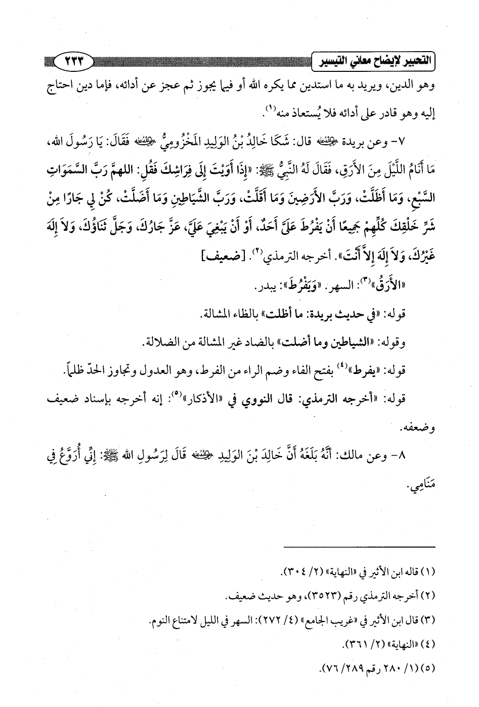 7 - وعن بريدة - رضي الله عنه - قال: شَكَا خَالِدُ بْنُ الوَلِيدِ المَخْزُوميُّ - رضي الله عنه - فقَالَ: يَا رَسُولَ الله، مَا أَنَامُ اللَّيْلَ مِنَ الأَرَقِ، فقَالَ لَهُ النَّبِيُّ - صلى الله عليه وسلم -: "إِذَا أَوَيْتَ إِلَى فِرَاشِكَ فَقُلِ: اللهمَّ رَبَّ السَّمَوَاتِ السَّبْعِ، وَمَا أَظَلَّتْ، رَبَّ الأَرَضِينَ وَمَا أَقلَّتْ، وَرَبَّ الشَّيَاطِينِ وَمَا أَضَلَّتْ، كُنْ لِي جَارًا مِنْ شَرِّ خَلْقِكَ كُلِّهِمْ جَمِيعًا أَنْ يَفْرُطَ عَلَىَّ أَحَدٌ، أَوْ أَنْ يَبْغِيَ عَلَيَّ، عَزَّ جَارُكَ وَجَلَّ ثَنَاؤُكَ وَلاَ إِلَهَ غَيْرُكَ, وَلاَ إِلَهَ إِلاَّ أَنْتَ". أخرجه الترمذي (¬2). [ضعيف]