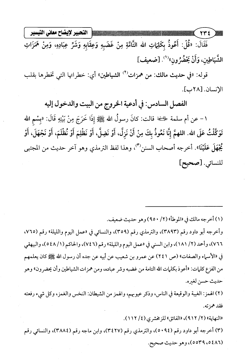 1 - عن أم سلمة - رضي الله عنها - قالت: كانَ رسولُ الله - صلى الله عليه وسلم - إِذَا خَرَجَ مِنْ بَيْتِهِ قَالَ: "بِسْمِ الله تَوَكَّلْتُ عَلَى الله. اللهمَّ إِنَّا نَعُوذُ بِكَ مِنْ أَنْ نَزِلَّ، أَوْ نَضِلَّ، أَوْ نَظْلِمَ أَوْ نُظْلَمَ، أَوْ نَجْهَلَ، أَوْ يُجْهَلَ عَلَيْنَا". أخرجه أصحاب السنن (¬3)، وهذا لفظ الترمذي وهو آخر حديث من المجتبى للنسائي. [صحيح]