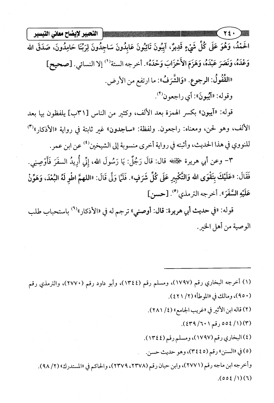 الحَمْدُ، وَهُوَ عَلَى كُلِّ شَيْءٍ قَدِيرٌ، آيِبُونَ تَائِبُونَ عَابِدُونَ سَاجِدُونَ لِرَبِّنَا حَامِدُونَ، صَدَقَ الله وَعْدَهُ، وَنَصَرَ عَبْدَهُ، وَهَزَمَ الأَحْزَابَ وَحْدَهُ". أخرجه الستة (¬1) إلا النسائي. [صحيح]